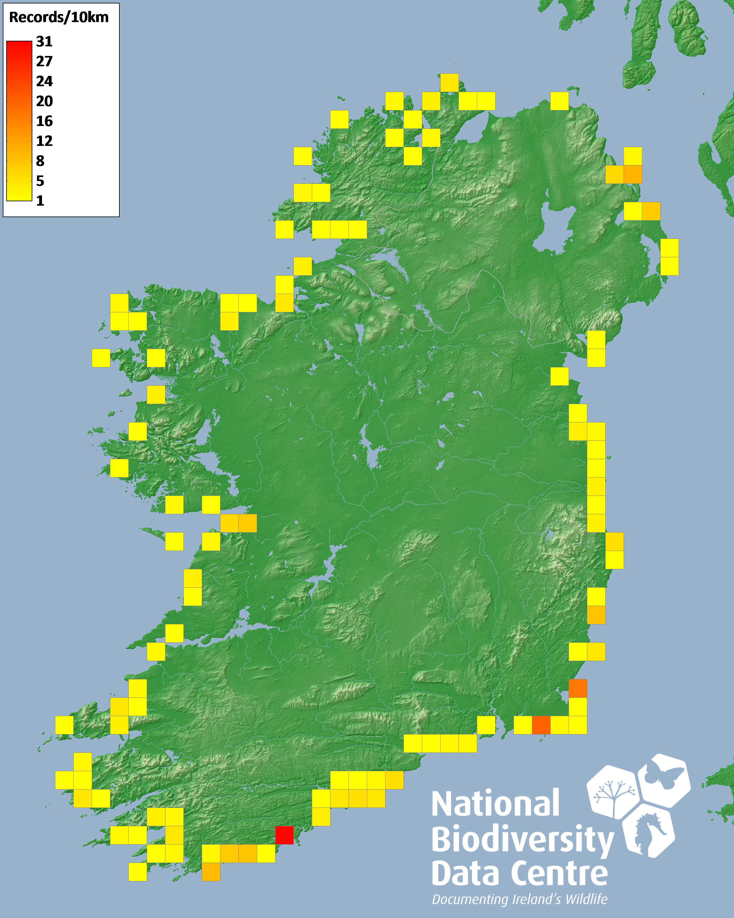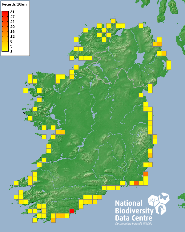 Distribution of the number of records recorded within each 10km grid square (ITM).Marine Map - 50km
