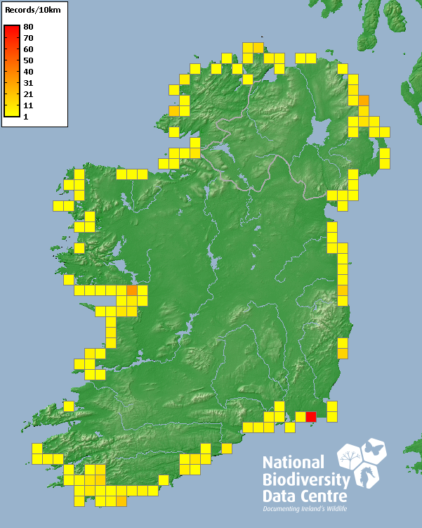 Distribution of the number of records recorded within each 10km grid square (ITM).Marine Map - 50km