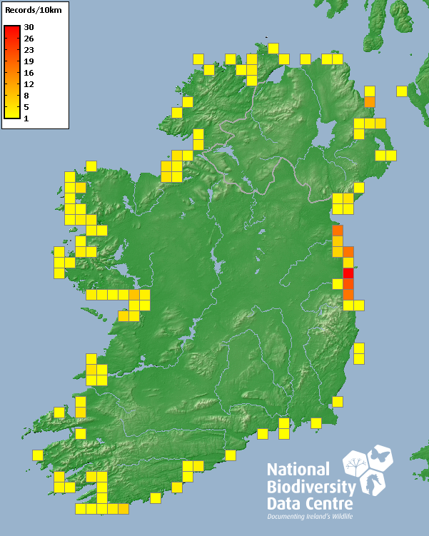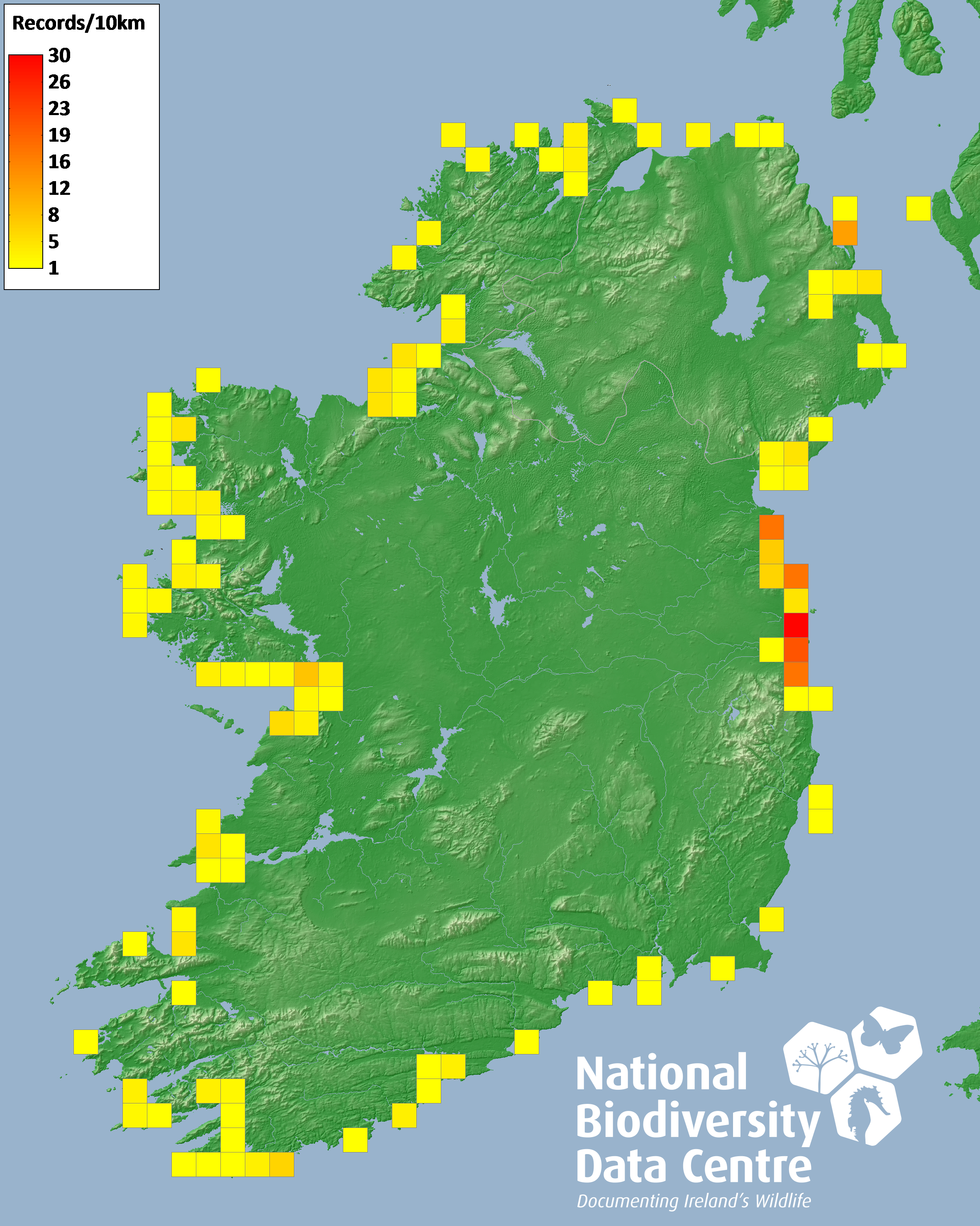 Distribution of the number of records recorded within each 10km grid square (ITM).Marine Map - 50km