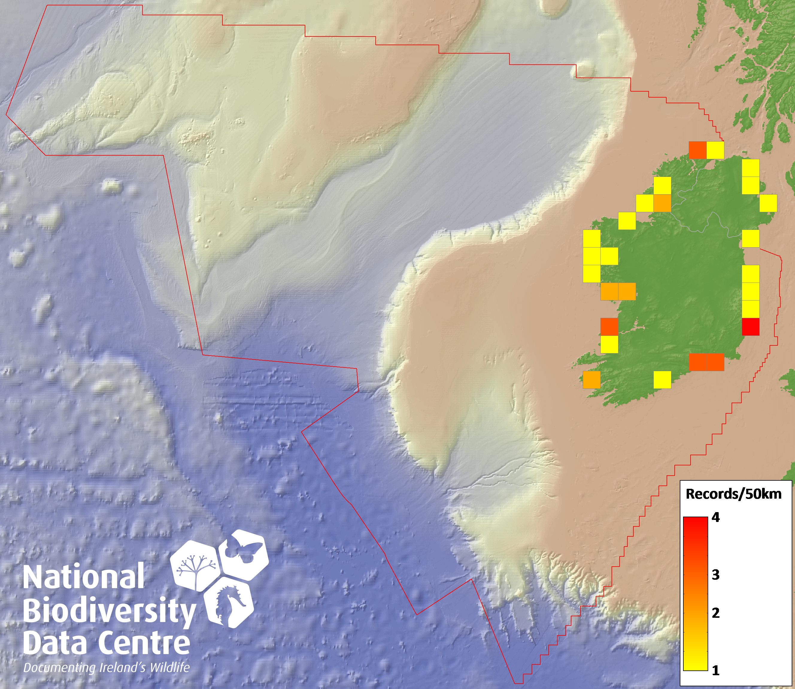 Distribution of the number of records recorded within each 10km grid square (ITM).Marine Map - 50km