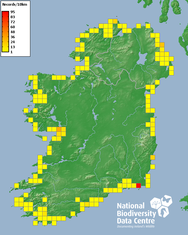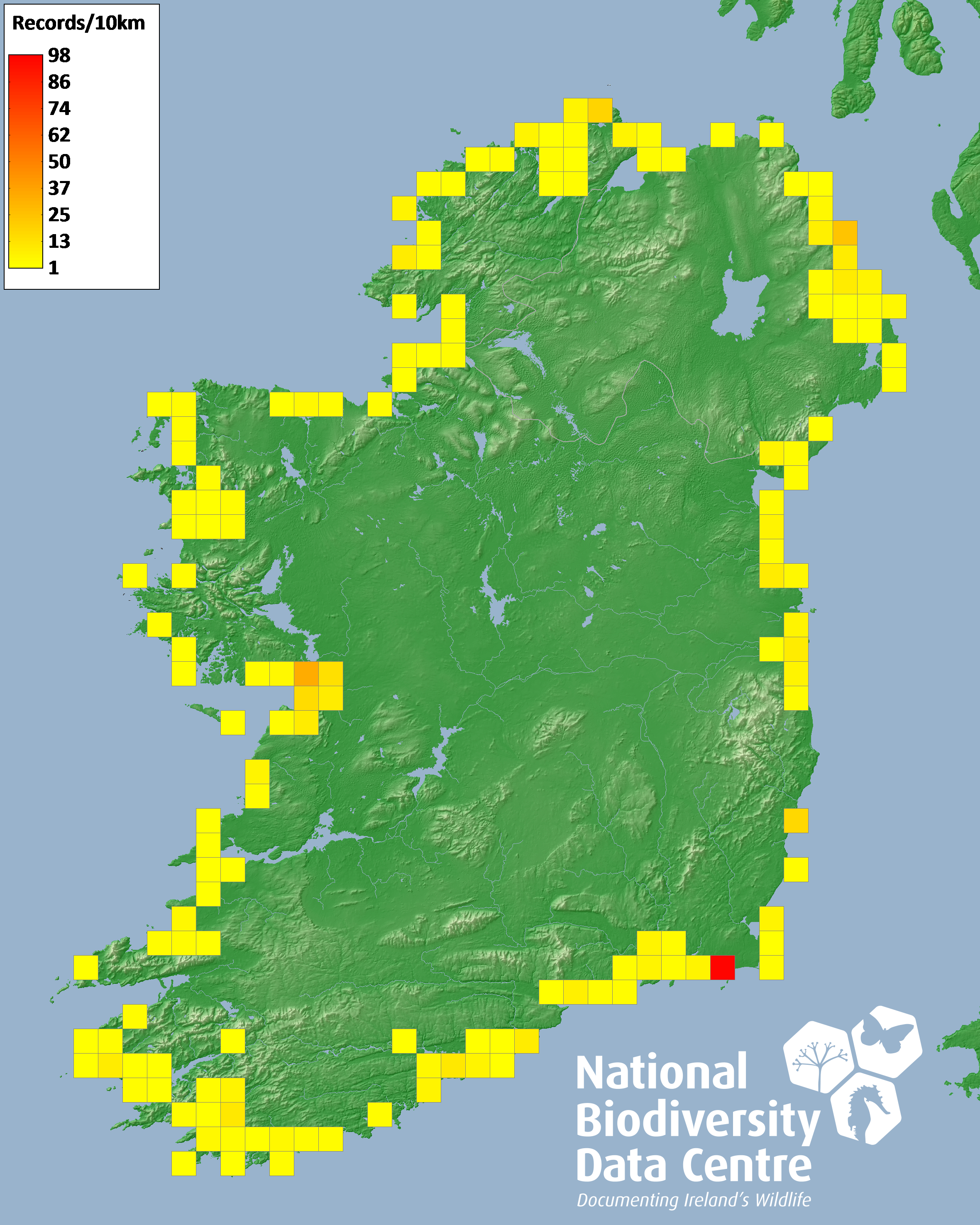 Distribution of the number of records recorded within each 10km grid square (ITM).Marine Map - 50km