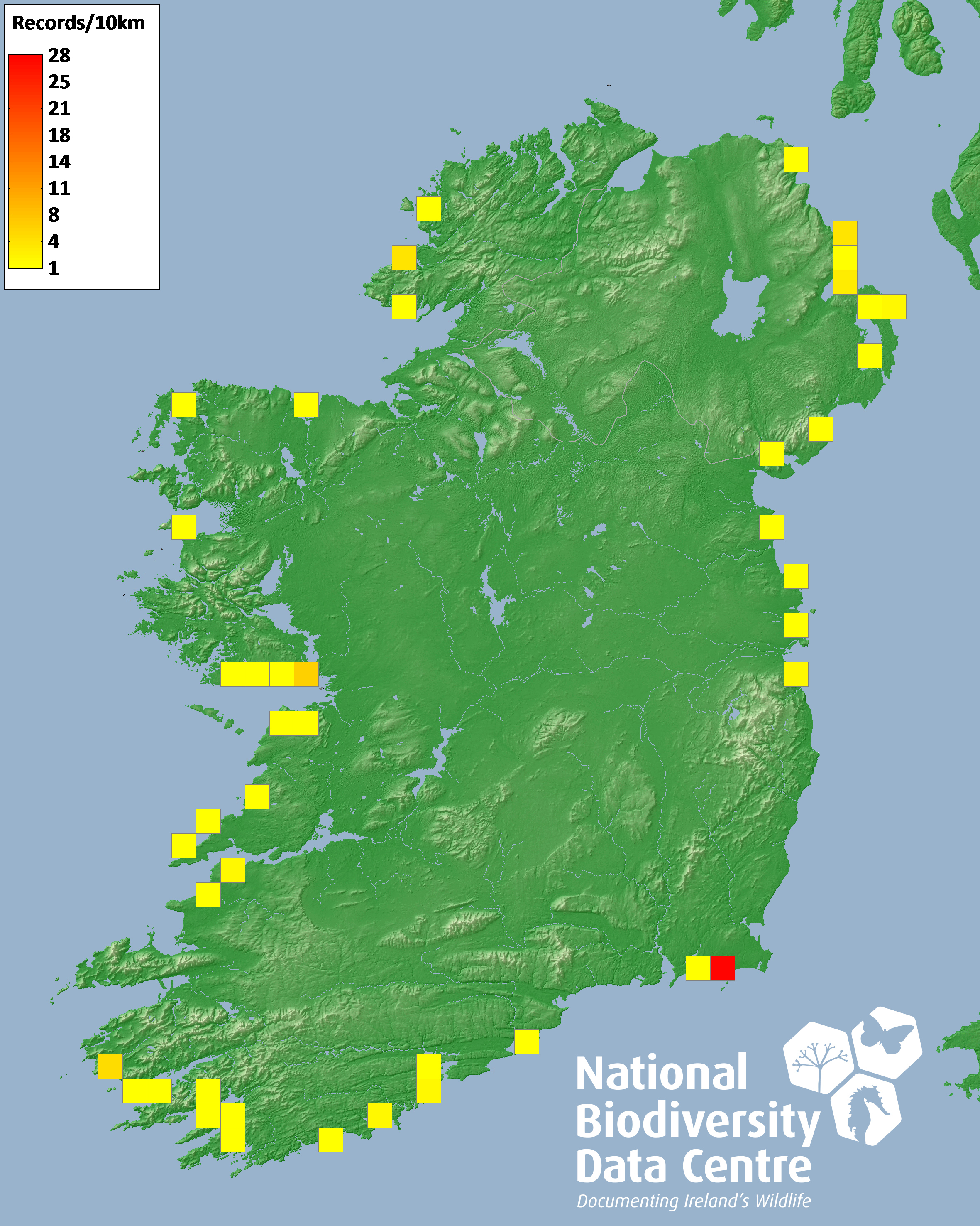 Distribution of the number of records recorded within each 10km grid square (ITM).Marine Map - 50km