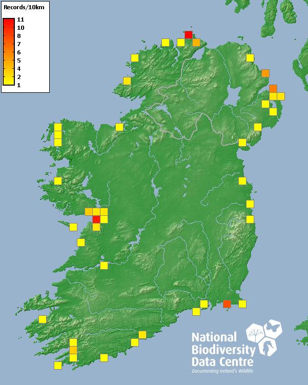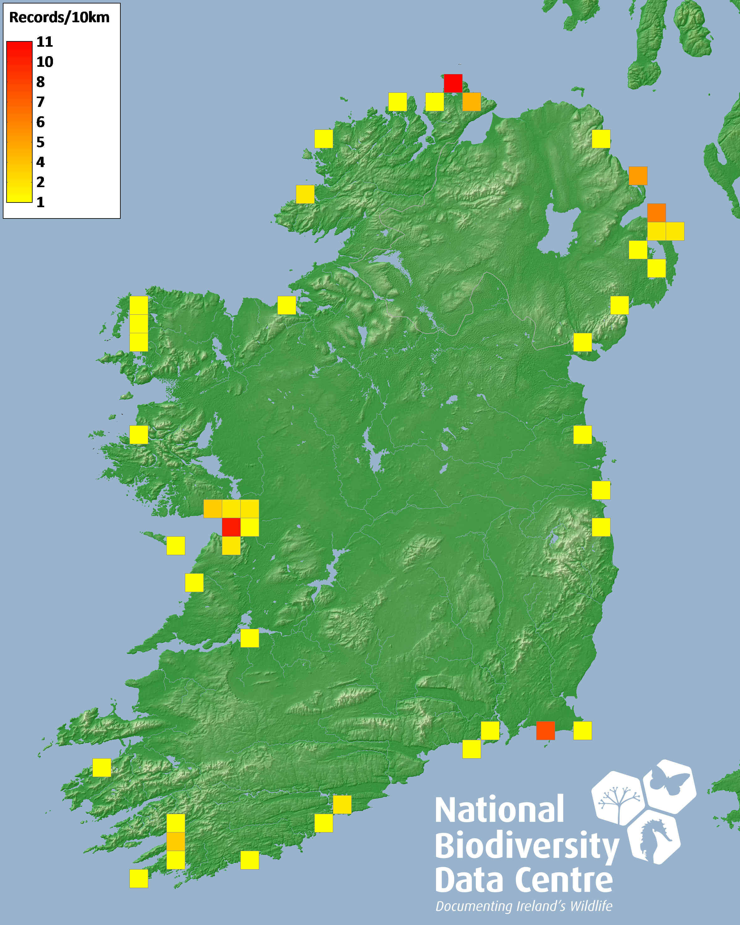 Distribution of the number of records recorded within each 10km grid square (ITM).Marine Map - 50km