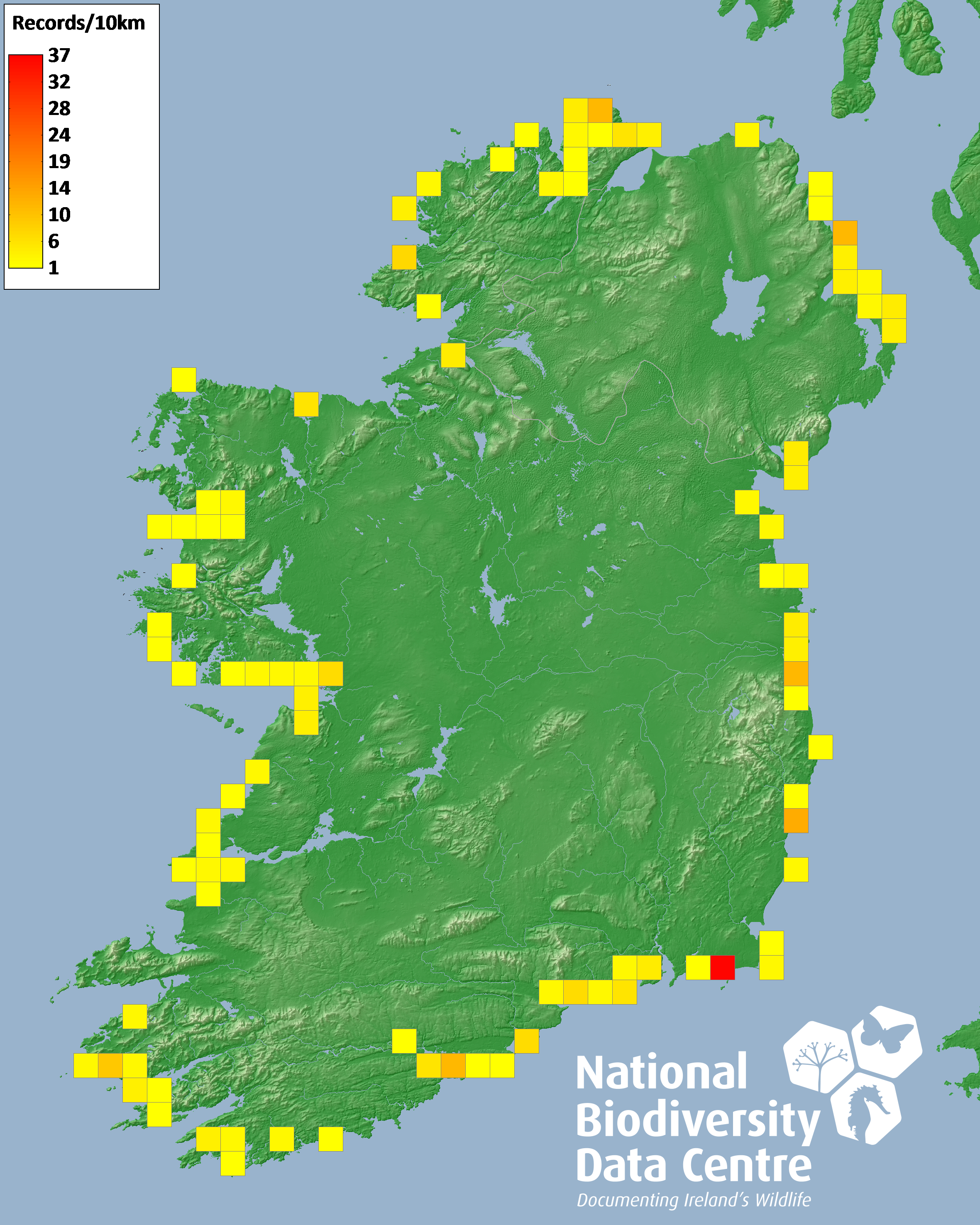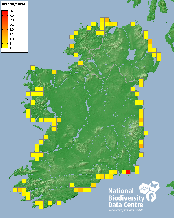 Distribution of the number of records recorded within each 10km grid square (ITM).Marine Map - 50km