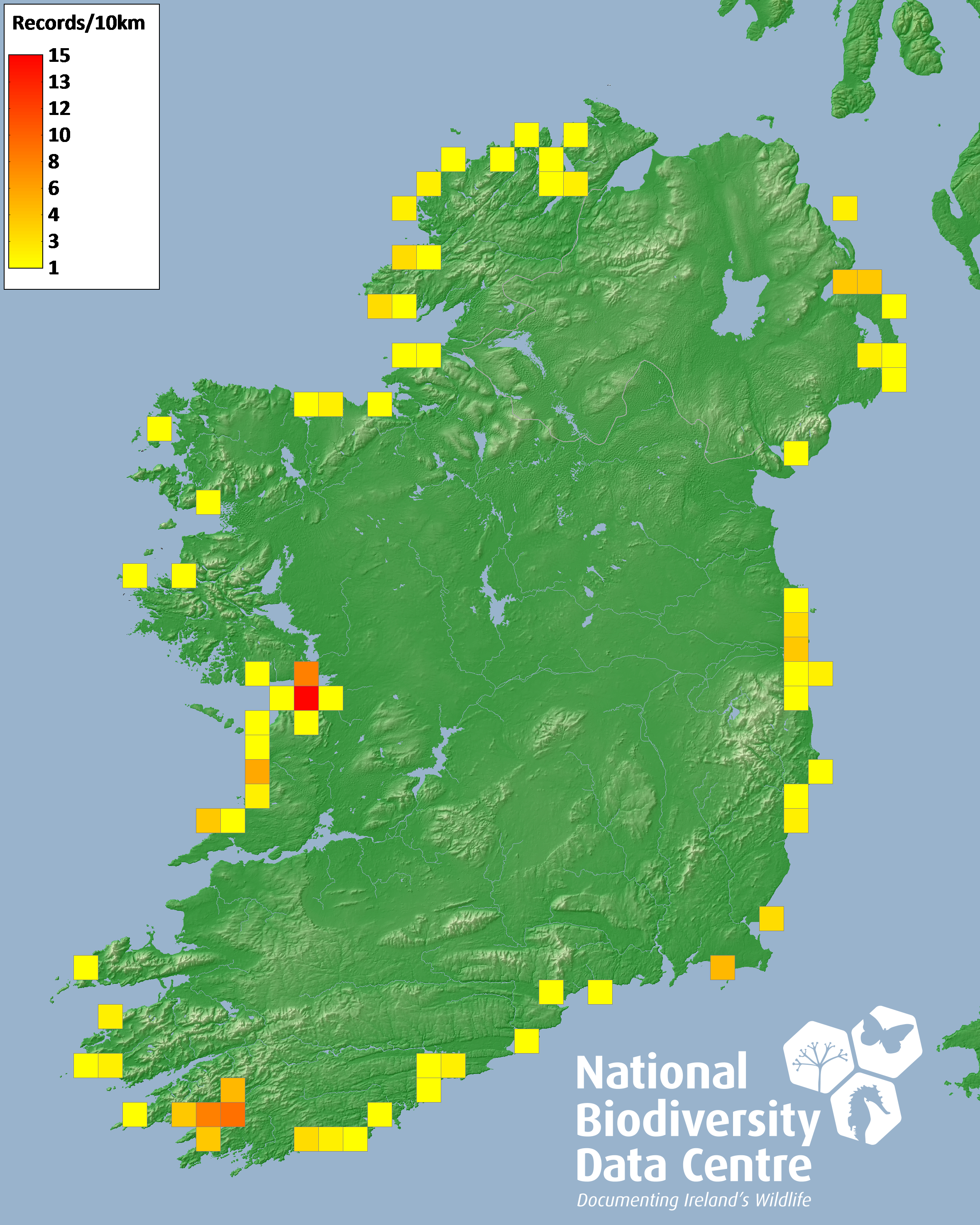 Distribution of the number of records recorded within each 10km grid square (ITM).Marine Map - 50km