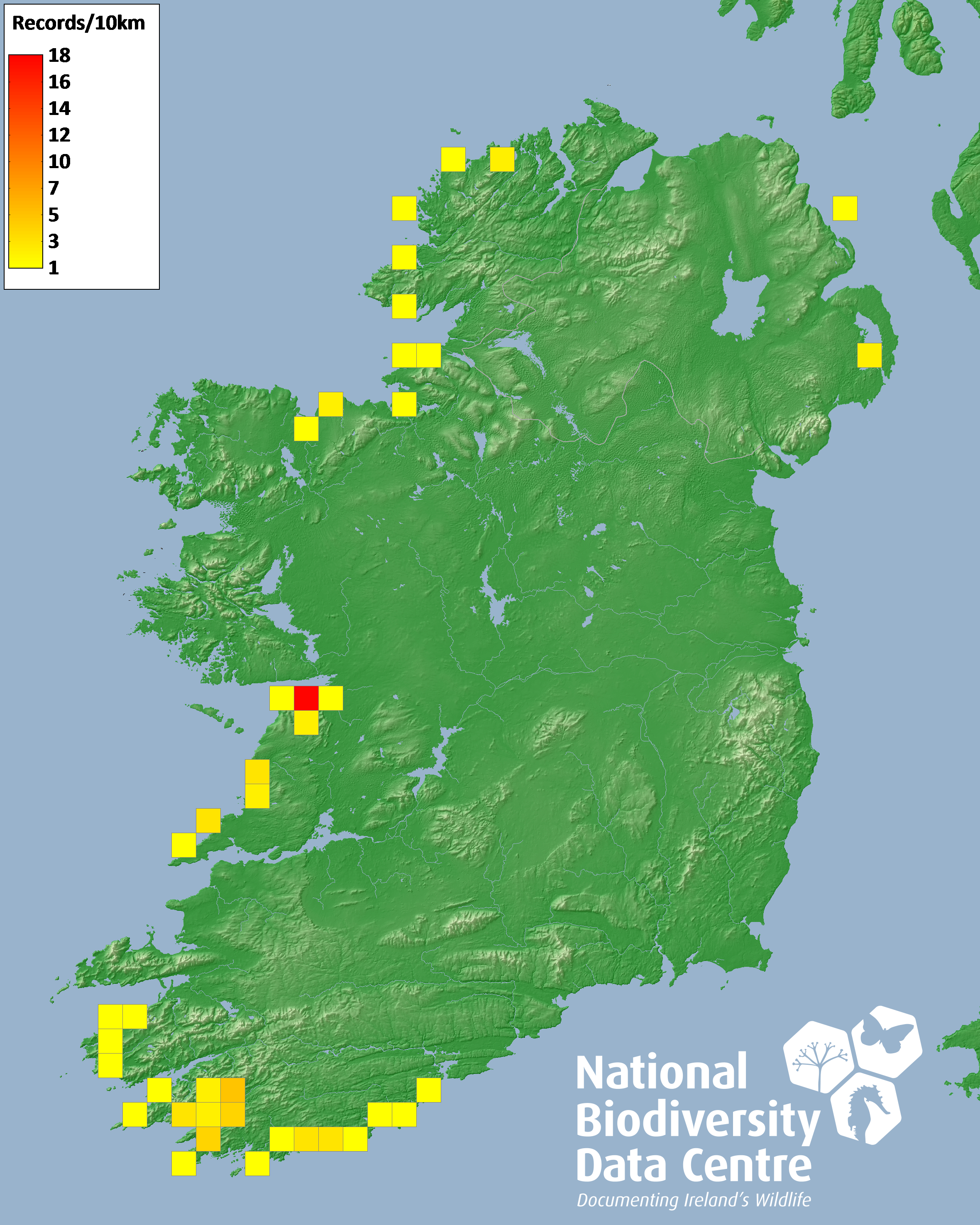 Distribution of the number of records recorded within each 10km grid square (ITM).Marine Map - 50km