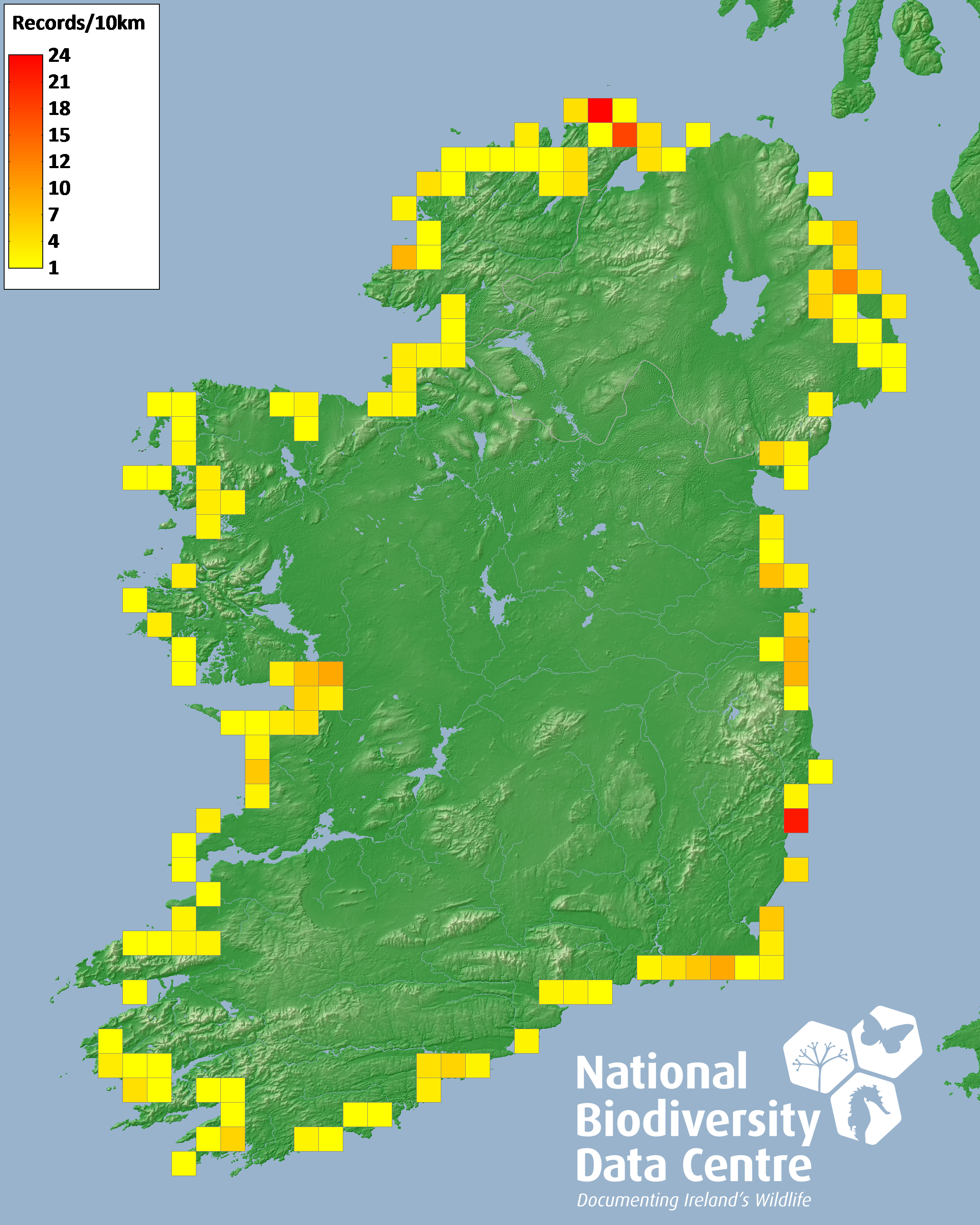 Distribution of the number of records recorded within each 10km grid square (ITM).Marine Map - 50km
