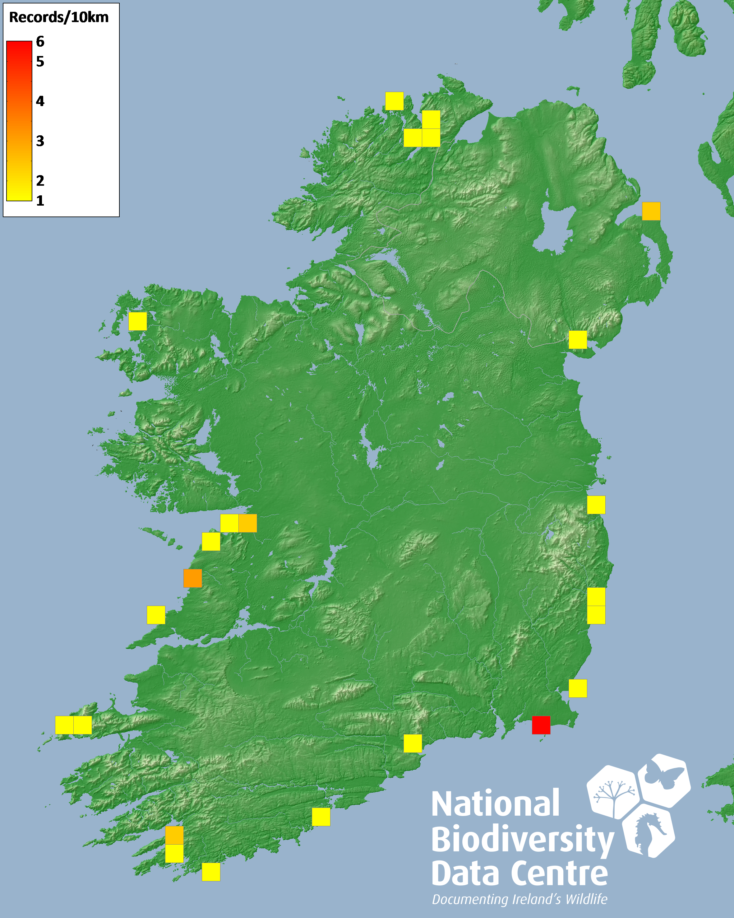Distribution of the number of records recorded within each 10km grid square (ITM).Marine Map - 50km