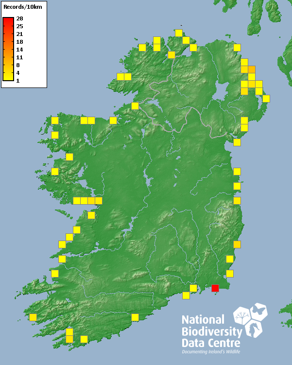 Distribution of the number of records recorded within each 10km grid square (ITM).Marine Map - 50km