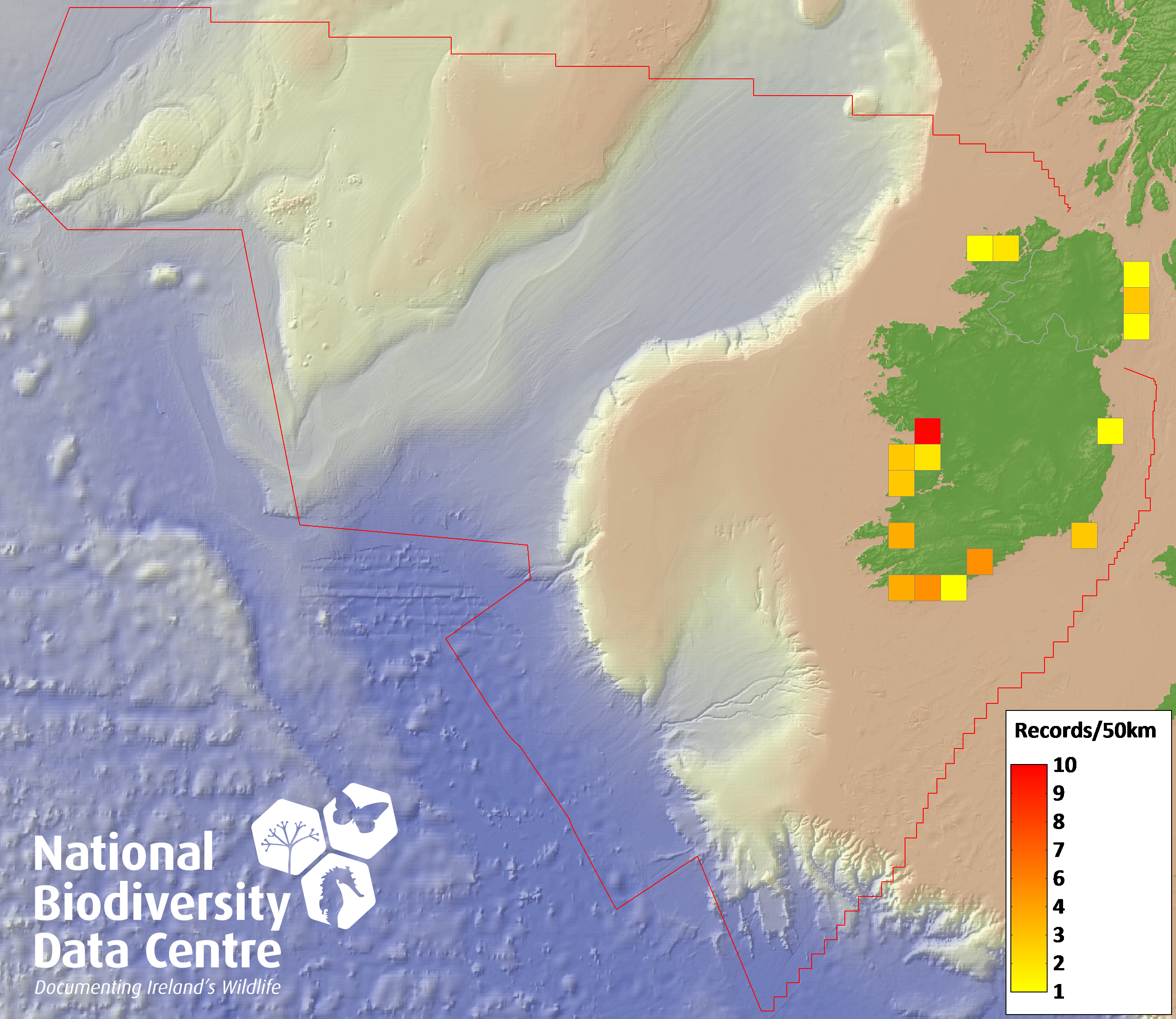 Distribution of the number of records recorded within each 10km grid square (ITM).Marine Map - 50km