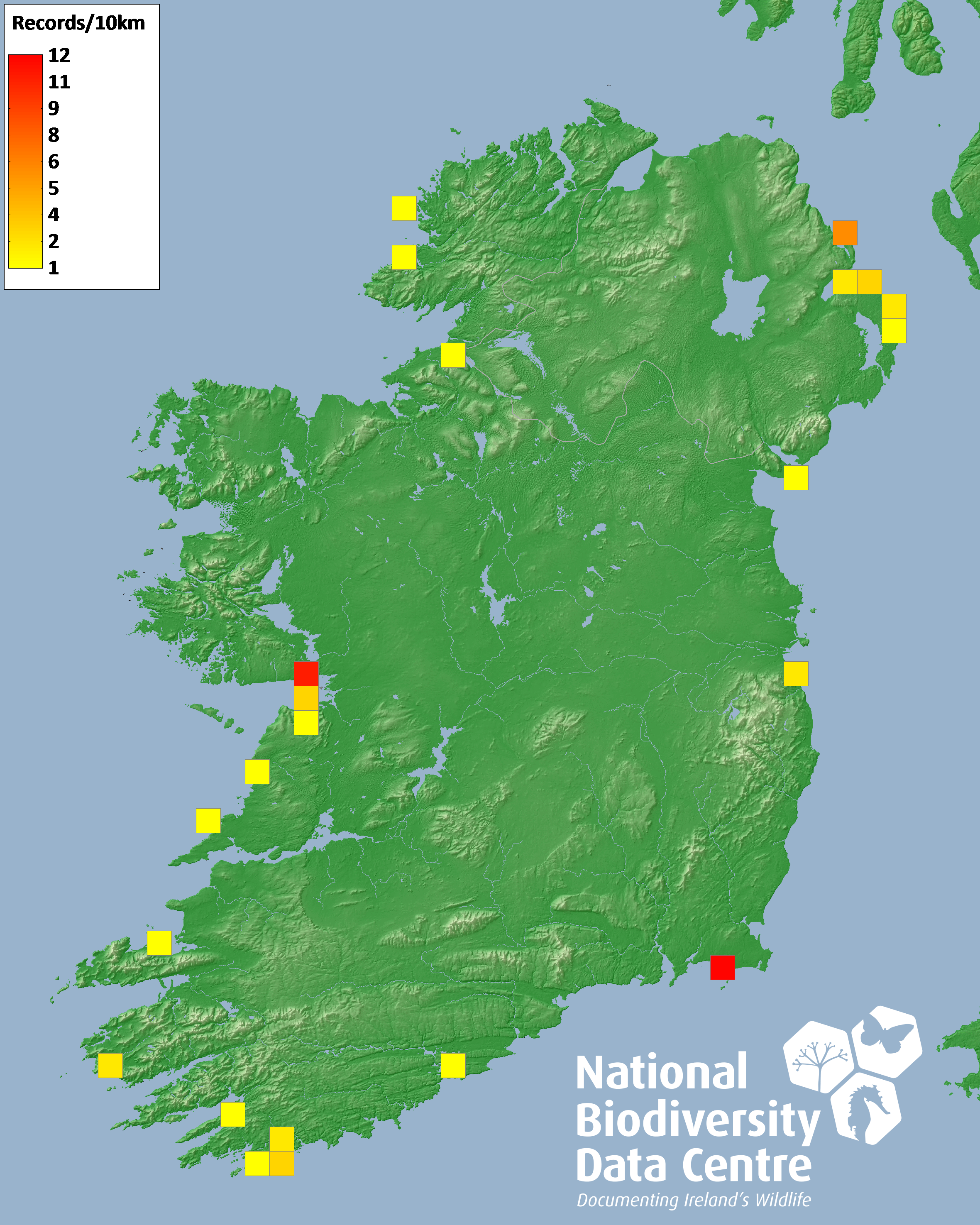 Distribution of the number of records recorded within each 10km grid square (ITM).Marine Map - 50km