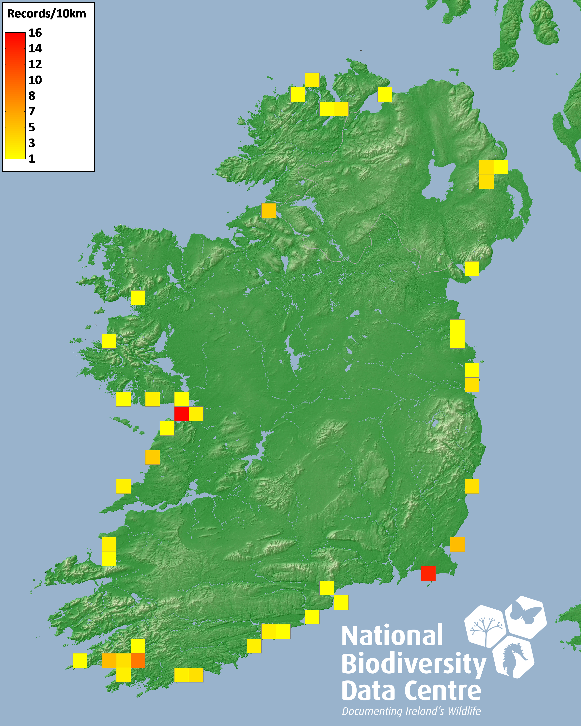 Distribution of the number of records recorded within each 10km grid square (ITM).Marine Map - 50km