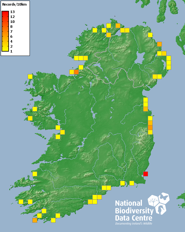 Distribution of the number of records recorded within each 10km grid square (ITM).Marine Map - 50km