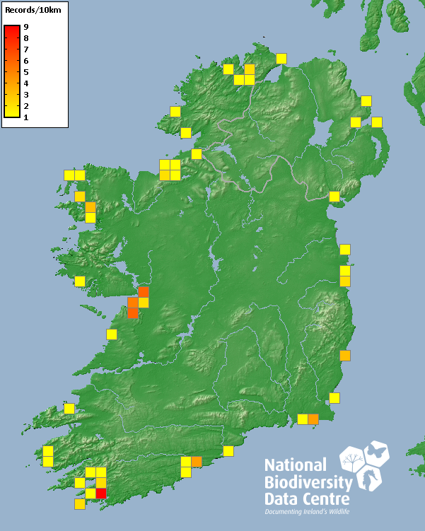Distribution of the number of records recorded within each 10km grid square (ITM).Marine Map - 50km