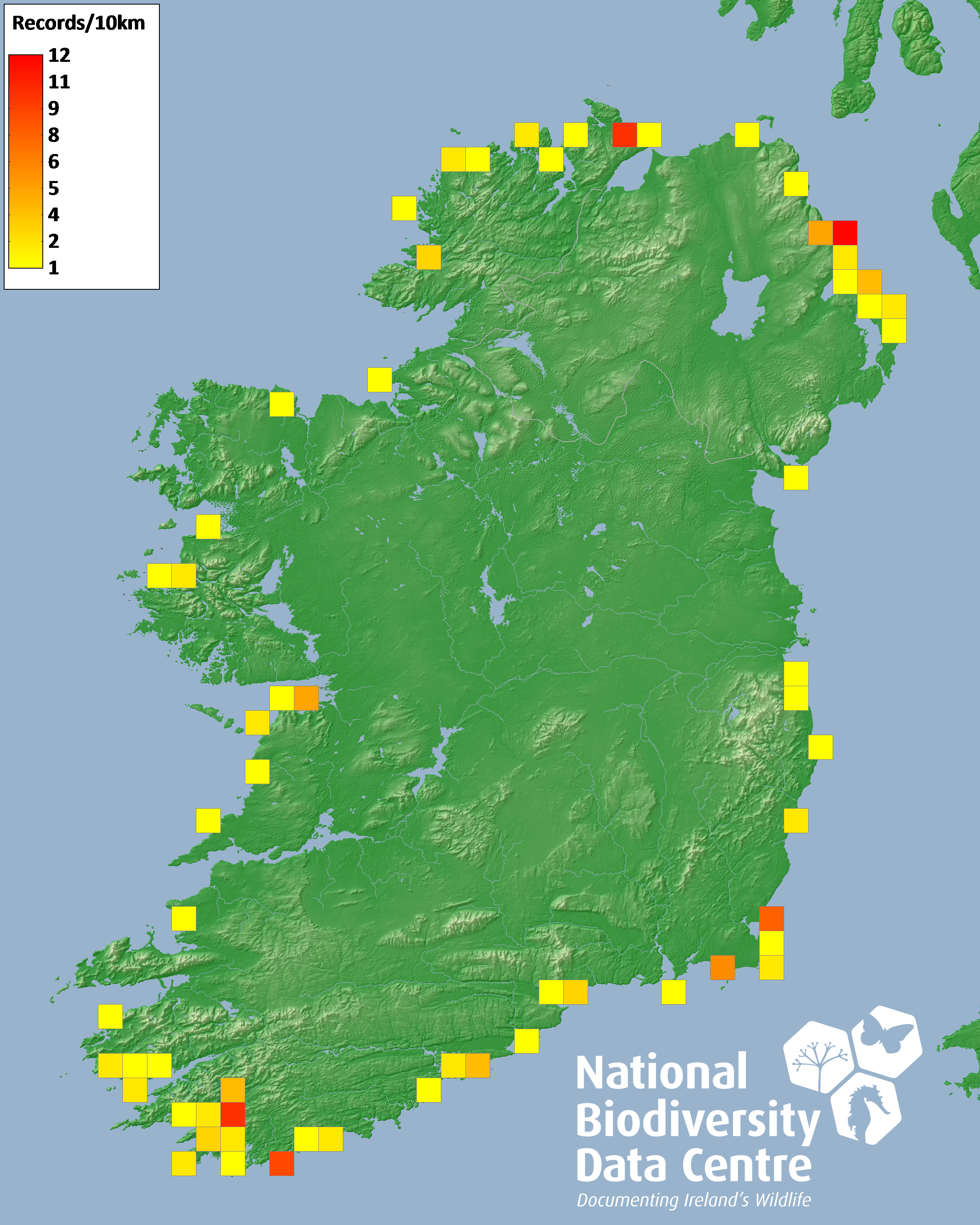 Distribution of the number of records recorded within each 10km grid square (ITM).Marine Map - 50km