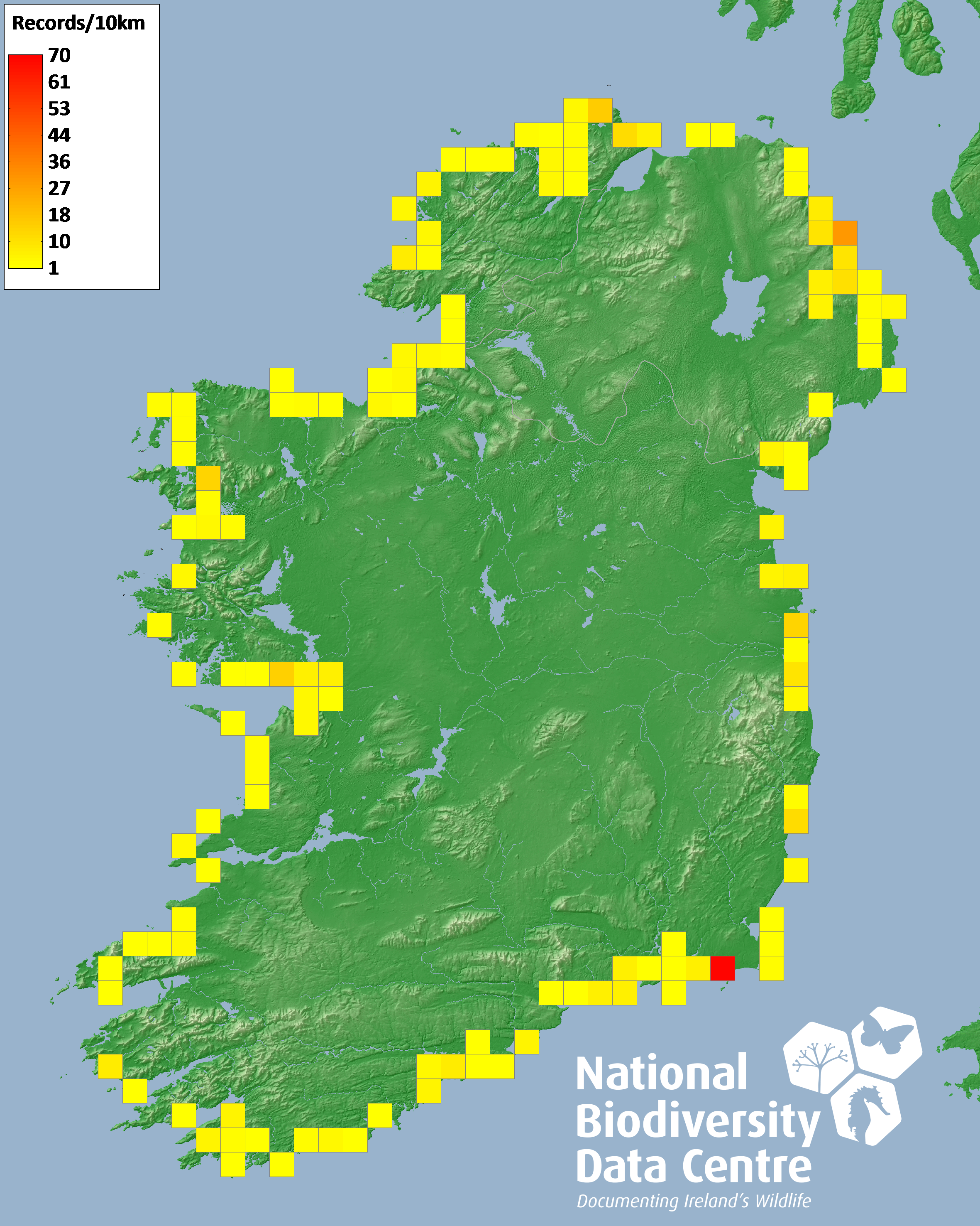 Distribution of the number of records recorded within each 10km grid square (ITM).Marine Map - 50km