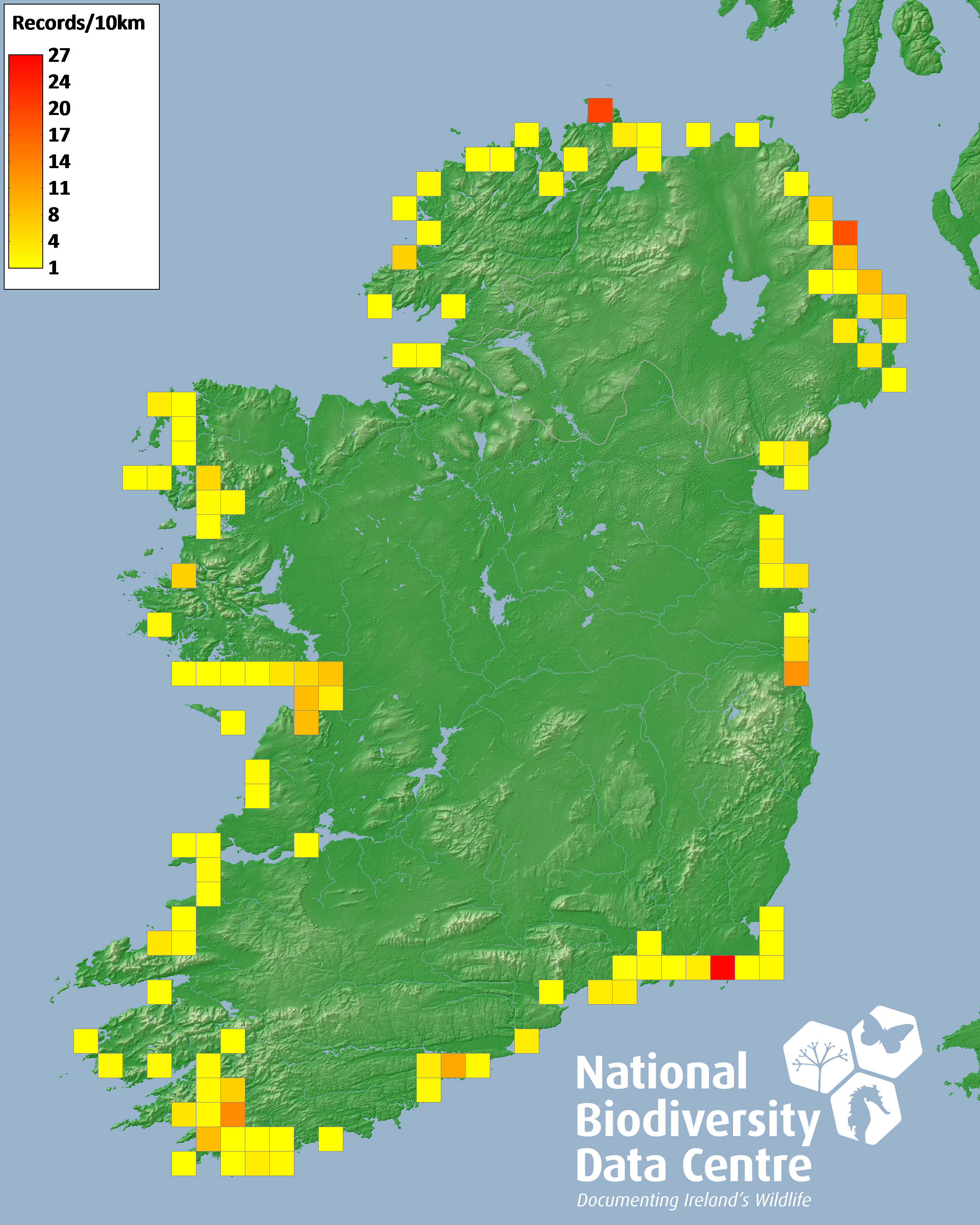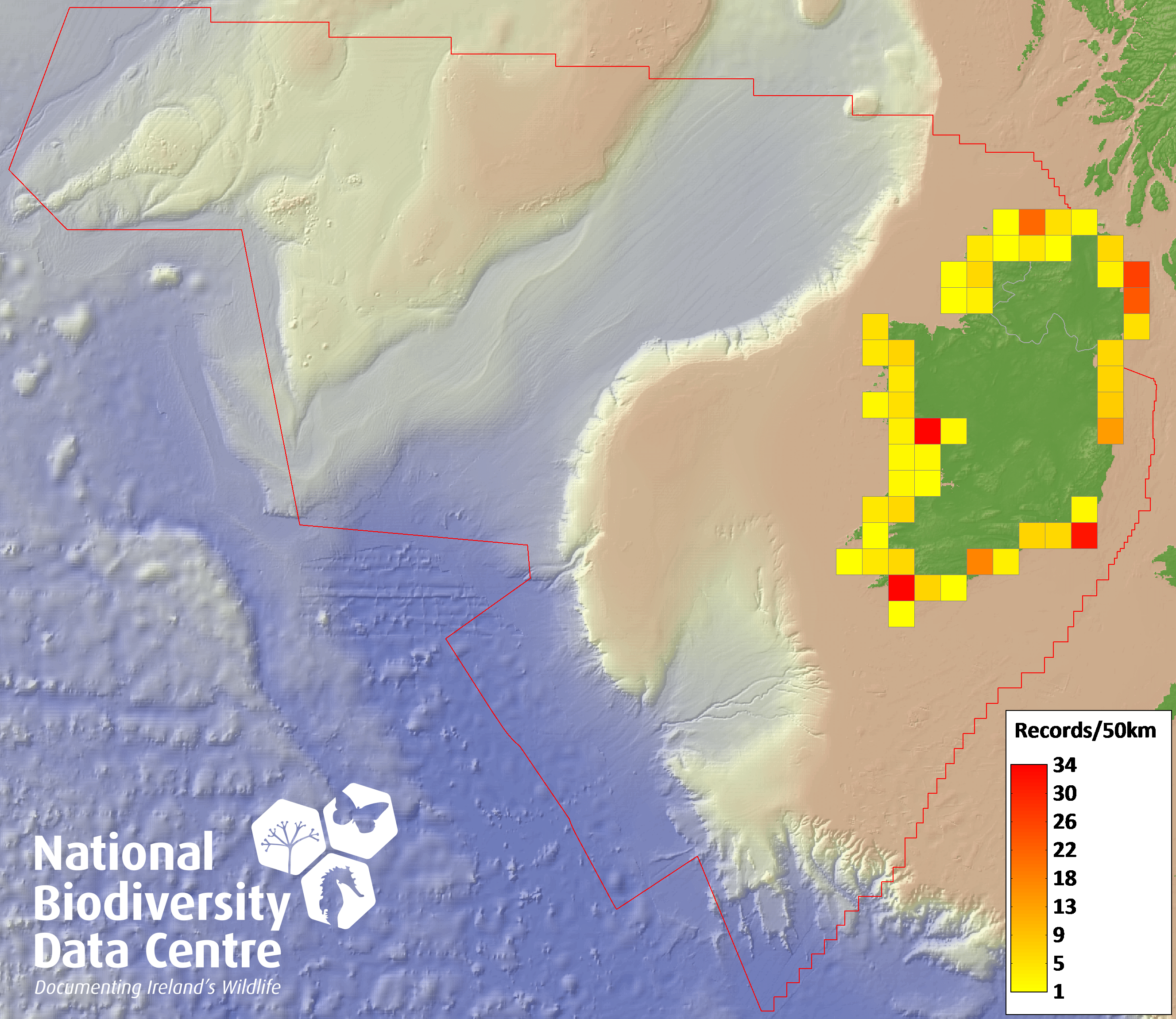 Distribution of the number of records recorded within each 10km grid square (ITM).Marine Map - 50km
