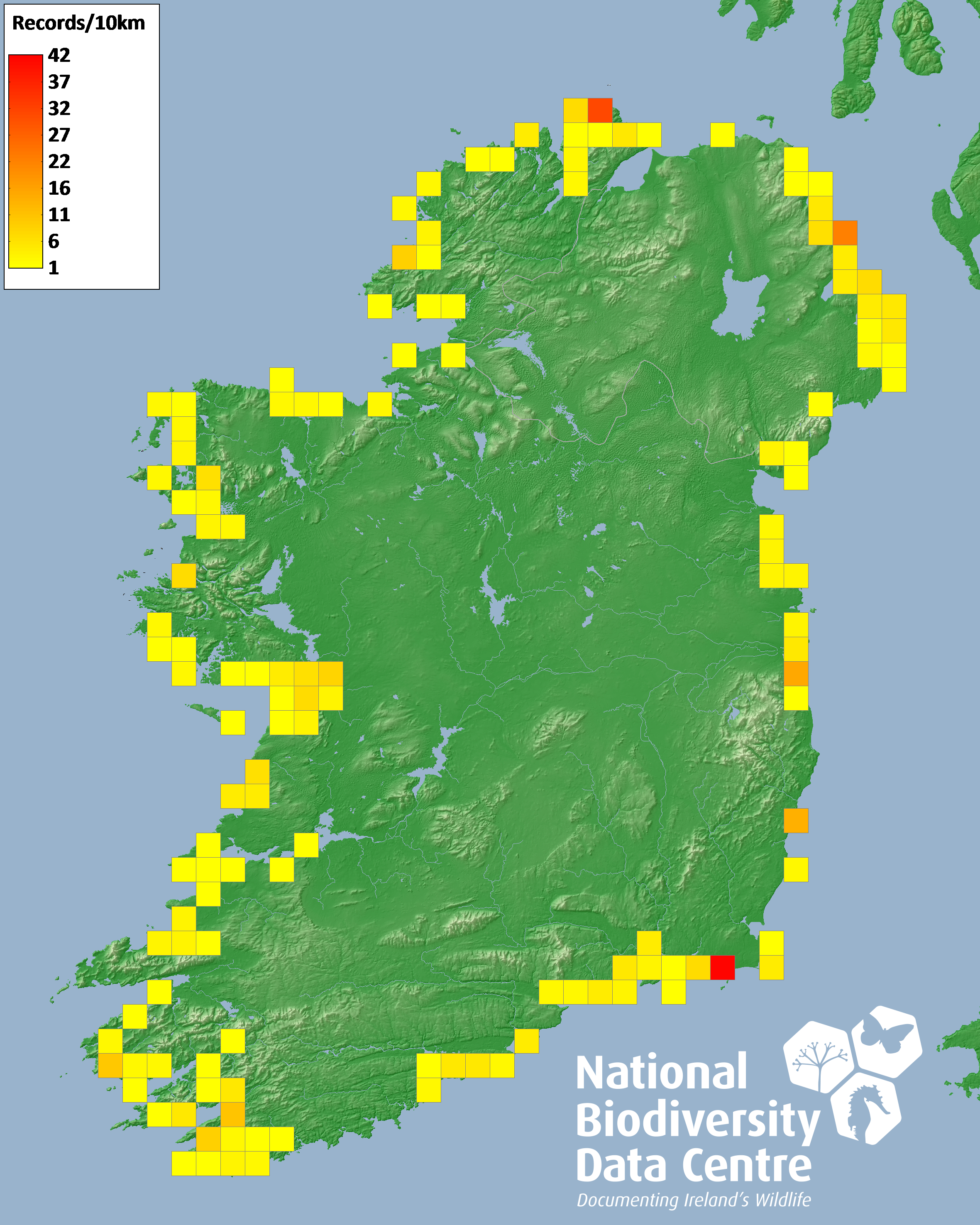 Distribution of the number of records recorded within each 10km grid square (ITM).Marine Map - 50km