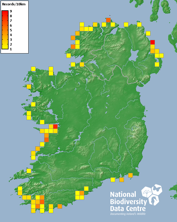 Distribution of the number of records recorded within each 10km grid square (ITM).Marine Map - 50km