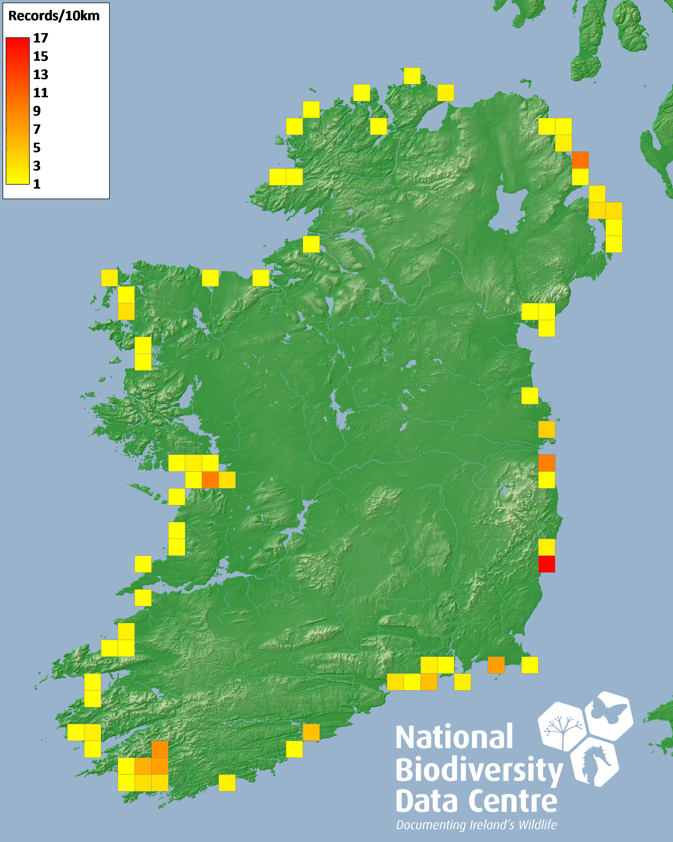Distribution of the number of records recorded within each 10km grid square (ITM).Marine Map - 50km
