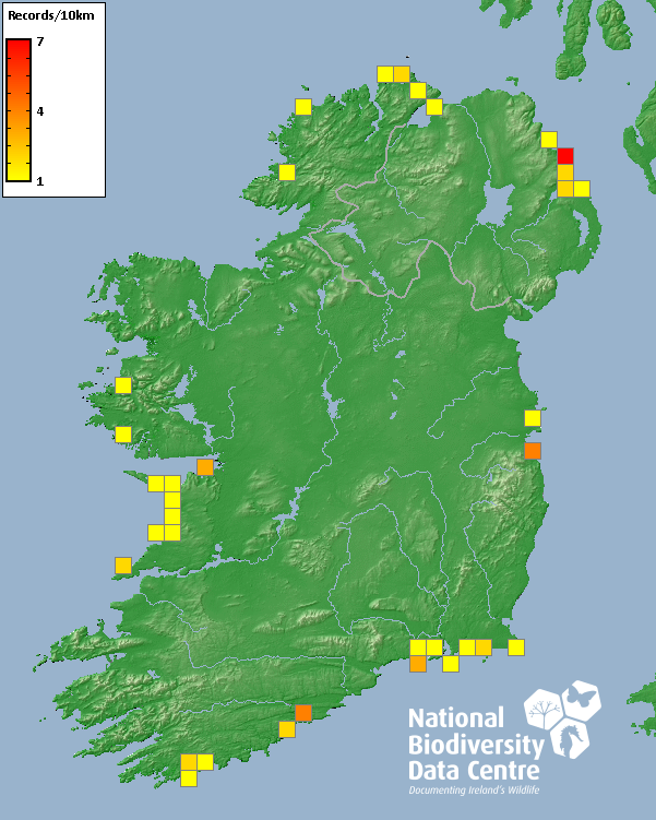 Distribution of the number of records recorded within each 10km grid square (ITM).Marine Map - 50km