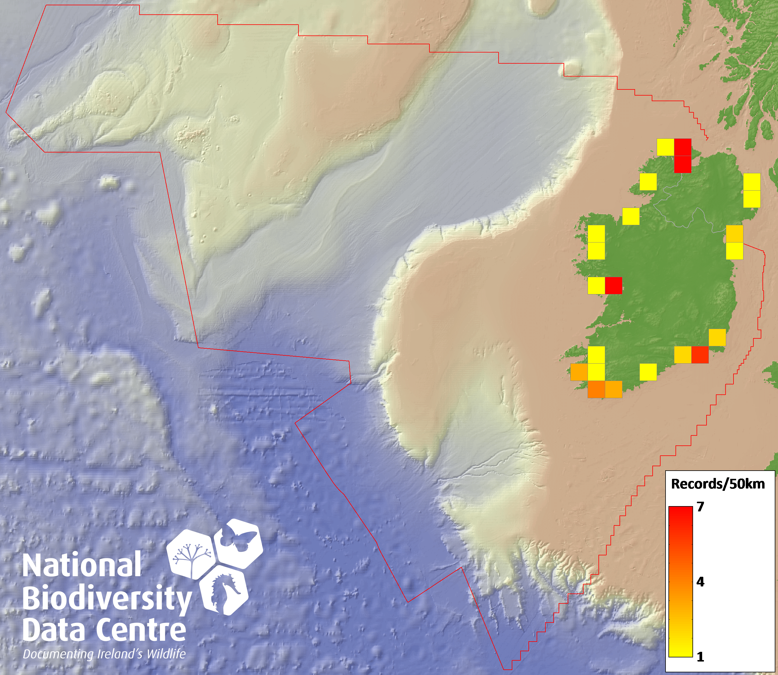 Distribution of the number of records recorded within each 10km grid square (ITM).Marine Map - 50km