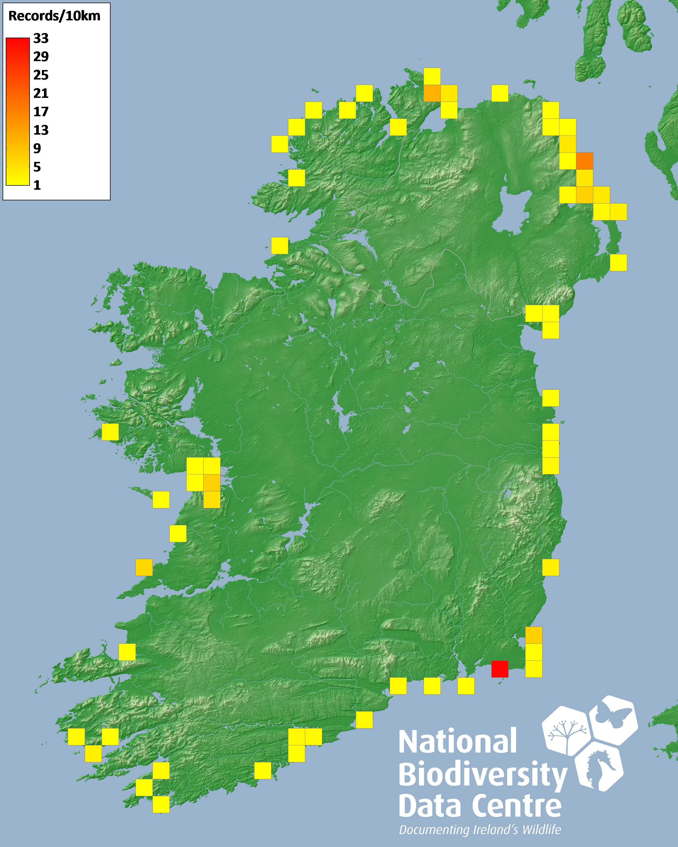 Distribution of the number of records recorded within each 10km grid square (ITM).Marine Map - 50km