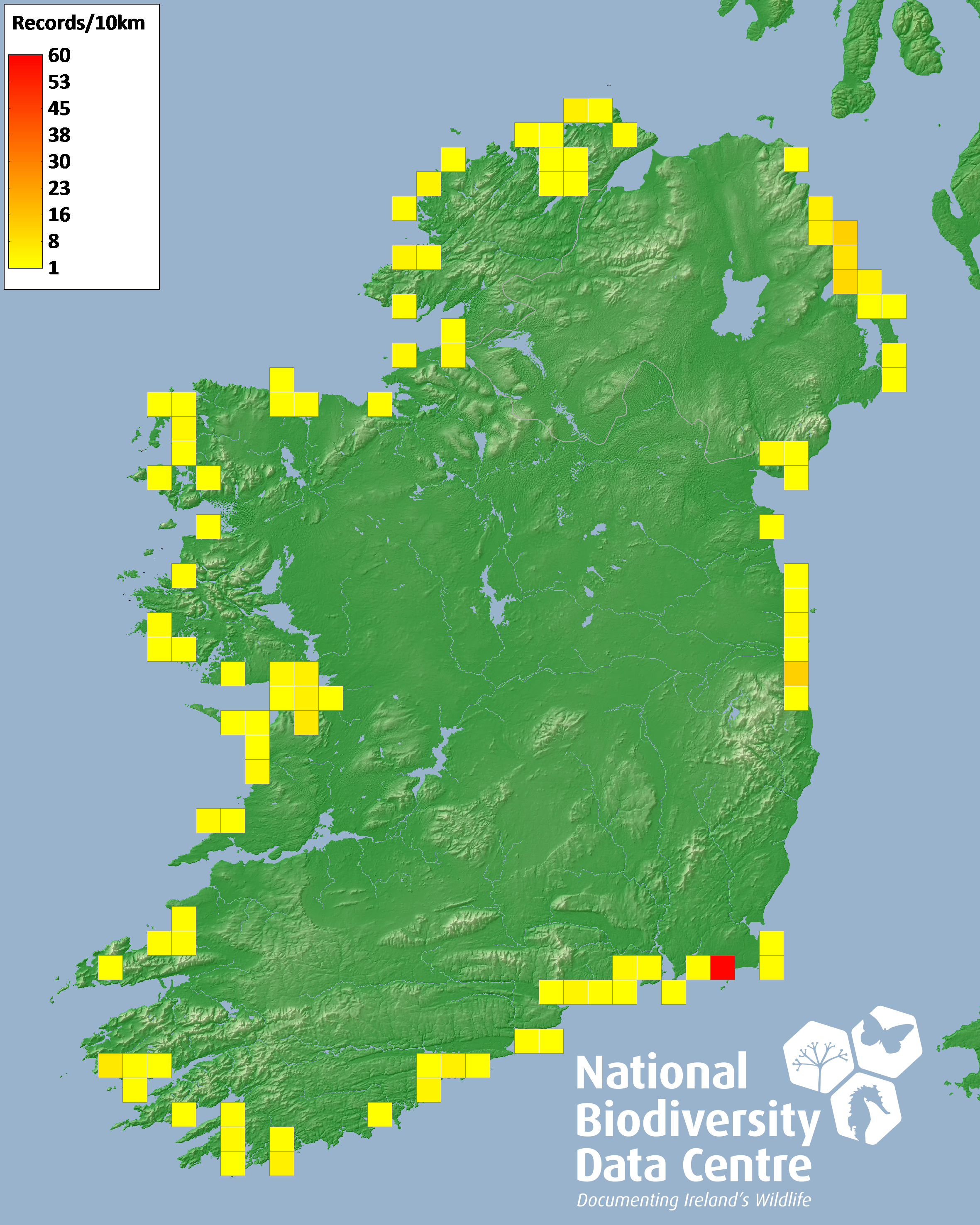 Distribution of the number of records recorded within each 10km grid square (ITM).Marine Map - 50km