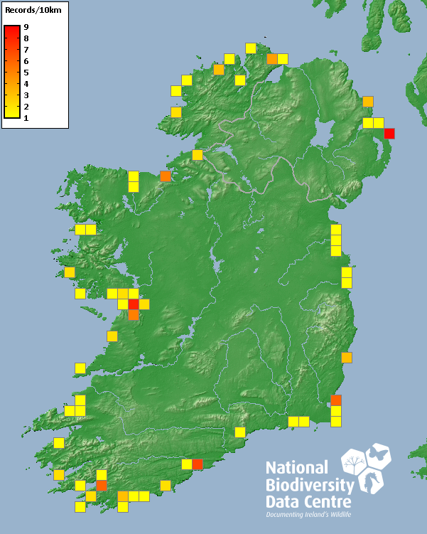 Distribution of the number of records recorded within each 10km grid square (ITM).Marine Map - 50km