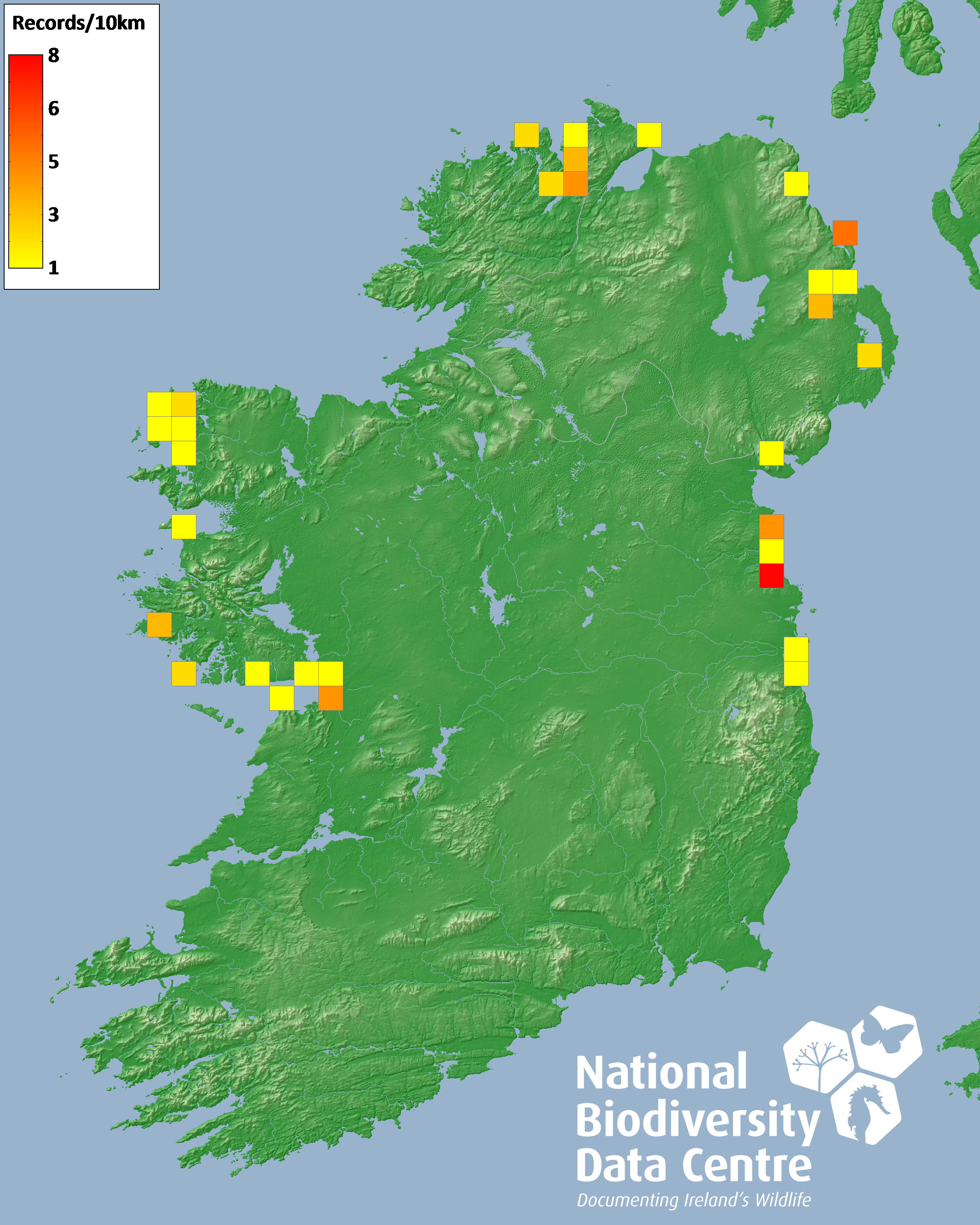 Distribution of the number of records recorded within each 10km grid square (ITM).Marine Map - 50km