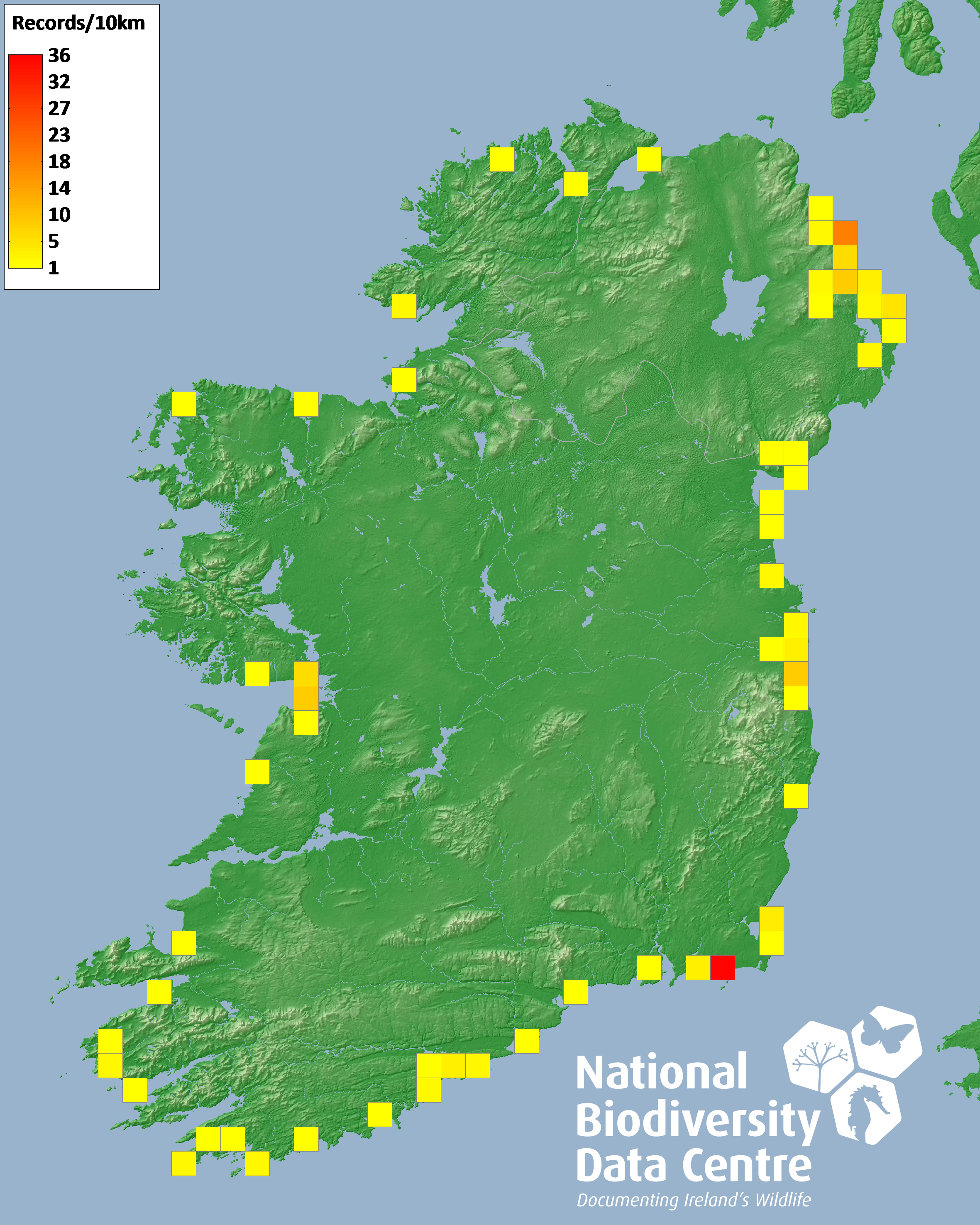 Distribution of the number of records recorded within each 10km grid square (ITM).Marine Map - 50km