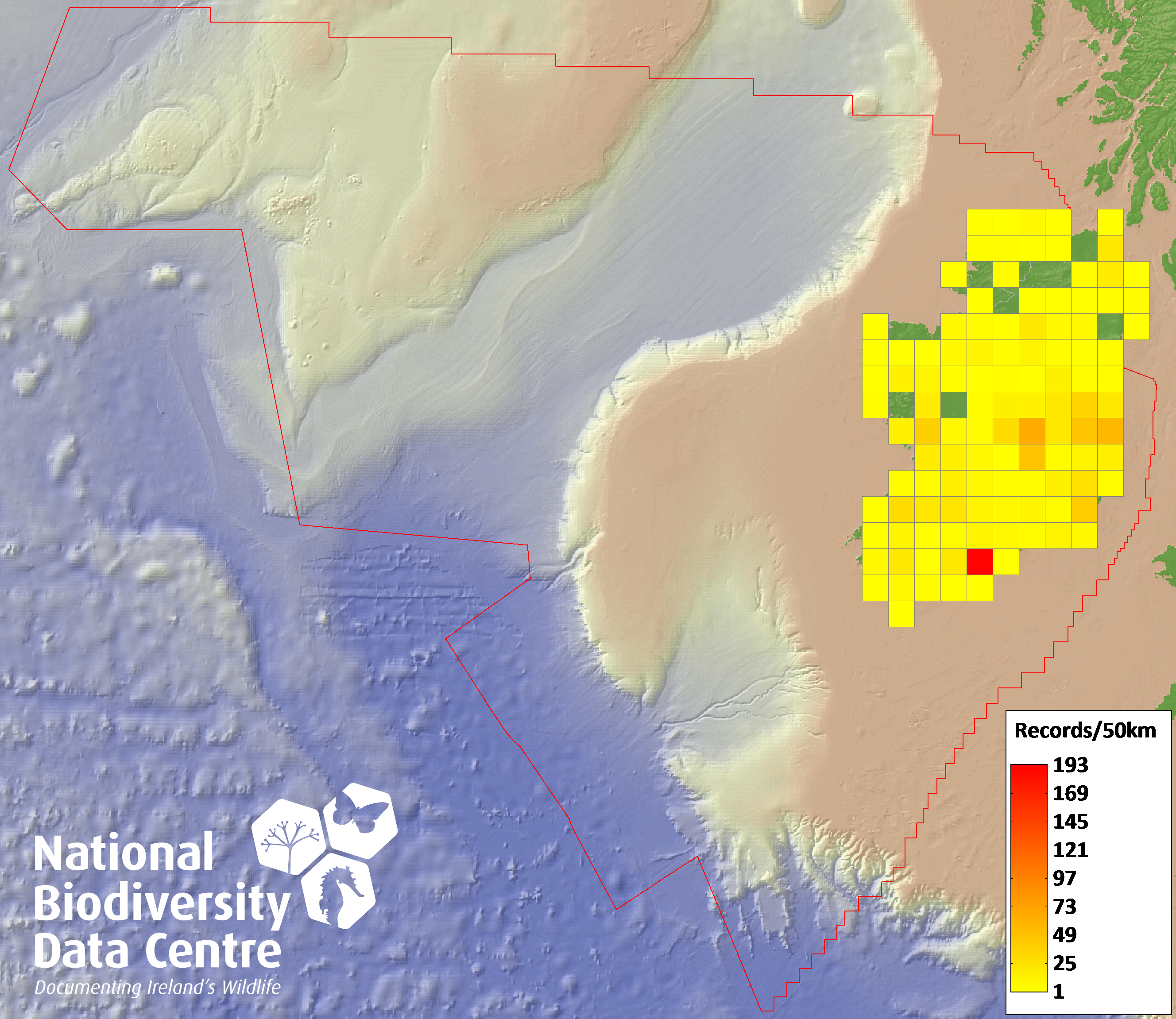 Distribution of the number of records within each 10km grid square (ITM).Marine Map - 50Km