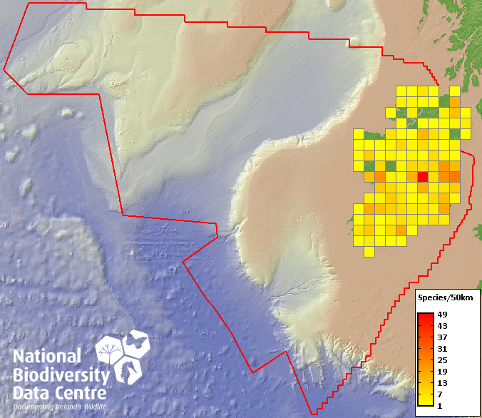 Distribution of the number of species recorded within each 10km grid square (ITM).Marine Map - 50Km