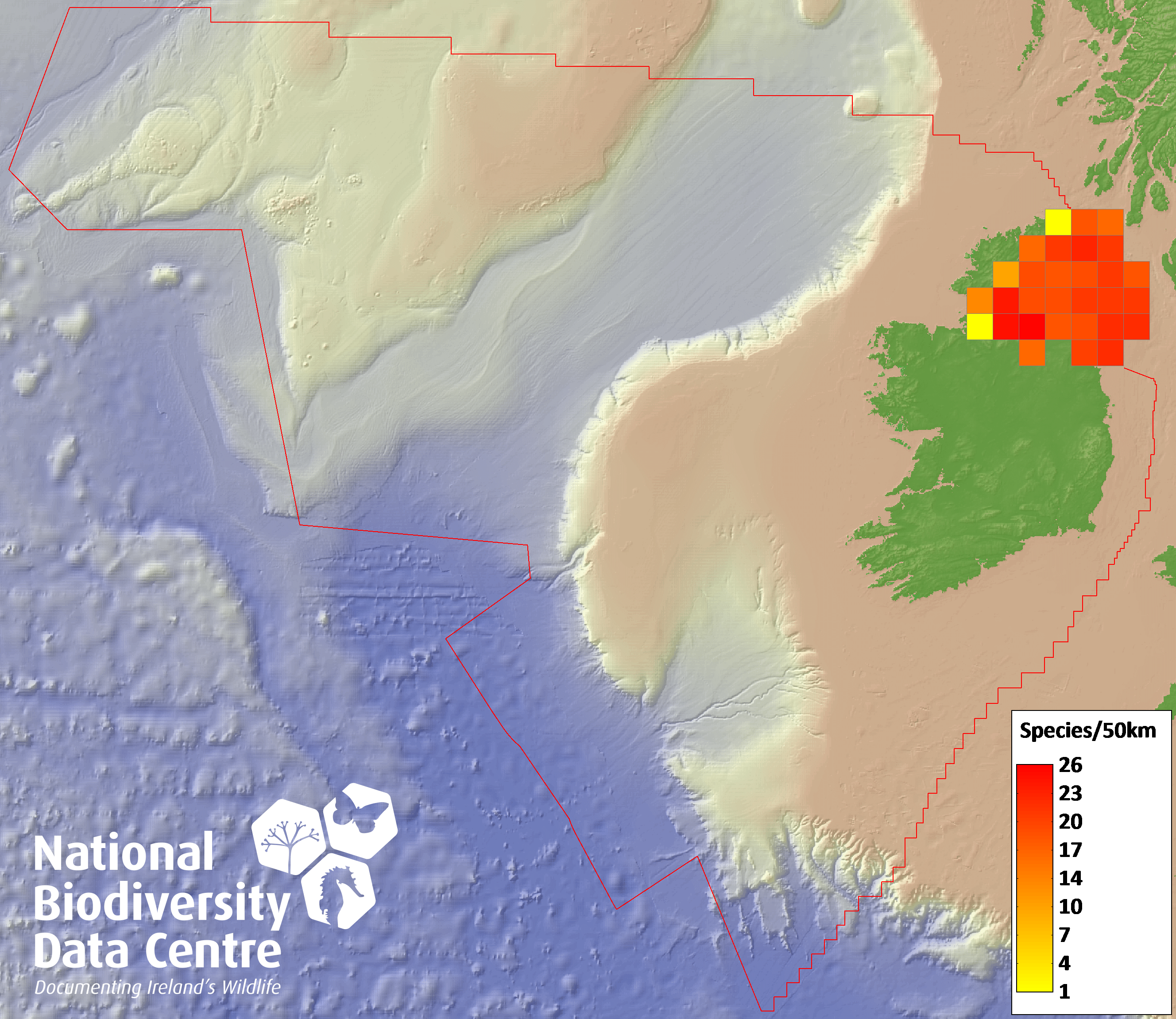 Distribution of the number of species recorded within each 10km grid square (ITM).Marine Map - 50Km