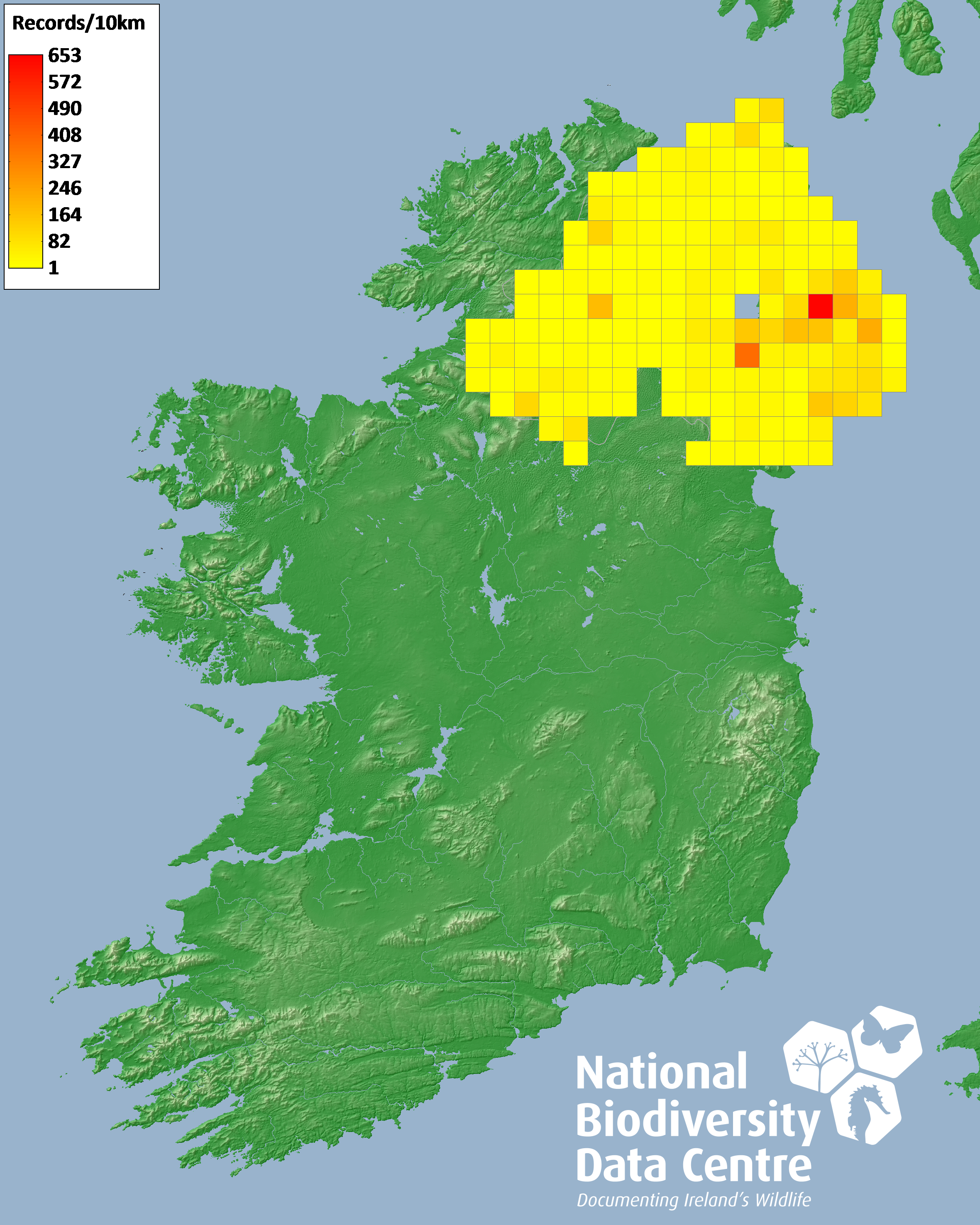 Distribution of the number of records recorded within each 10km grid square (ITM).Marine Map - 50km