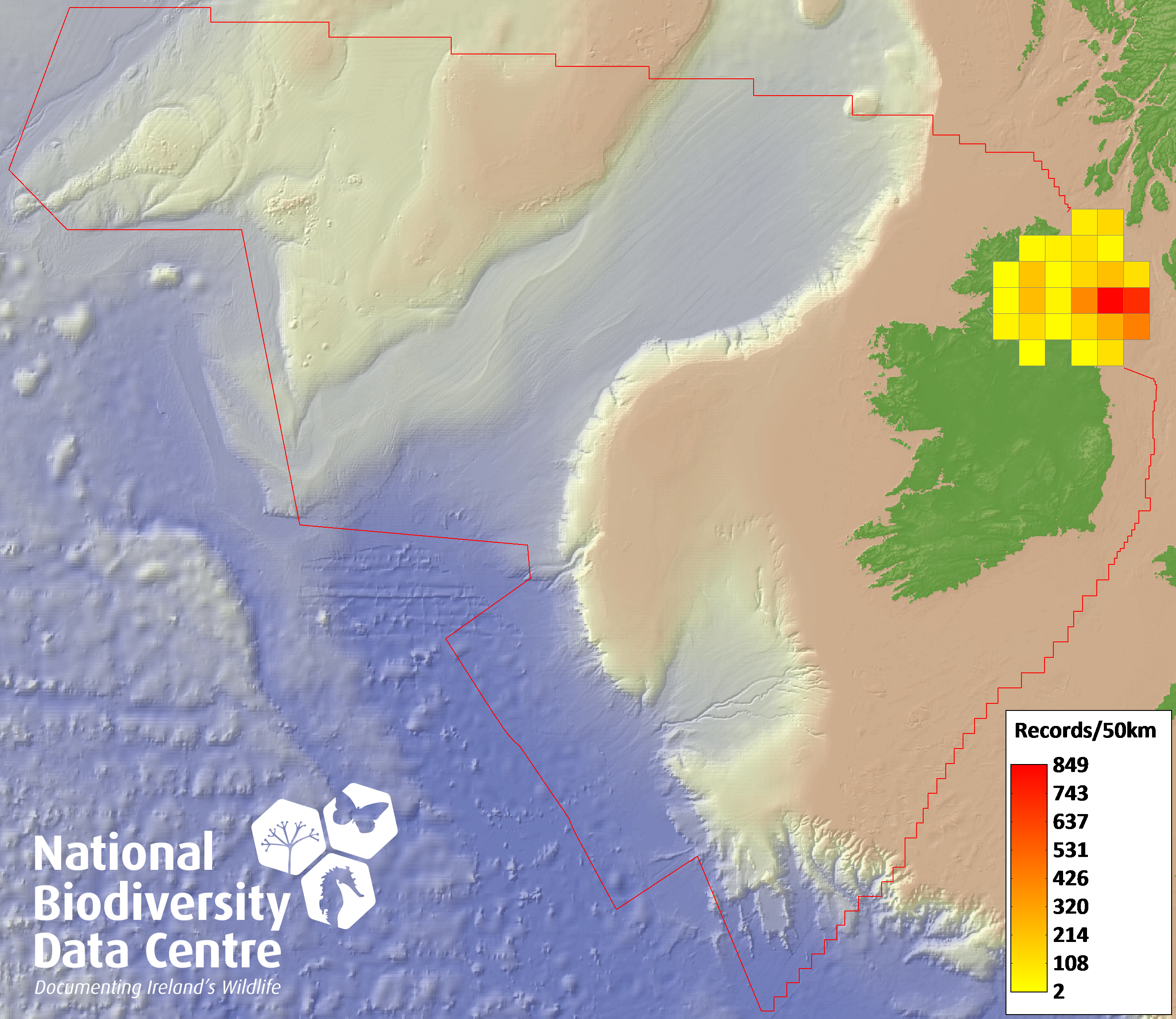 Distribution of the number of records recorded within each 10km grid square (ITM).Marine Map - 50km