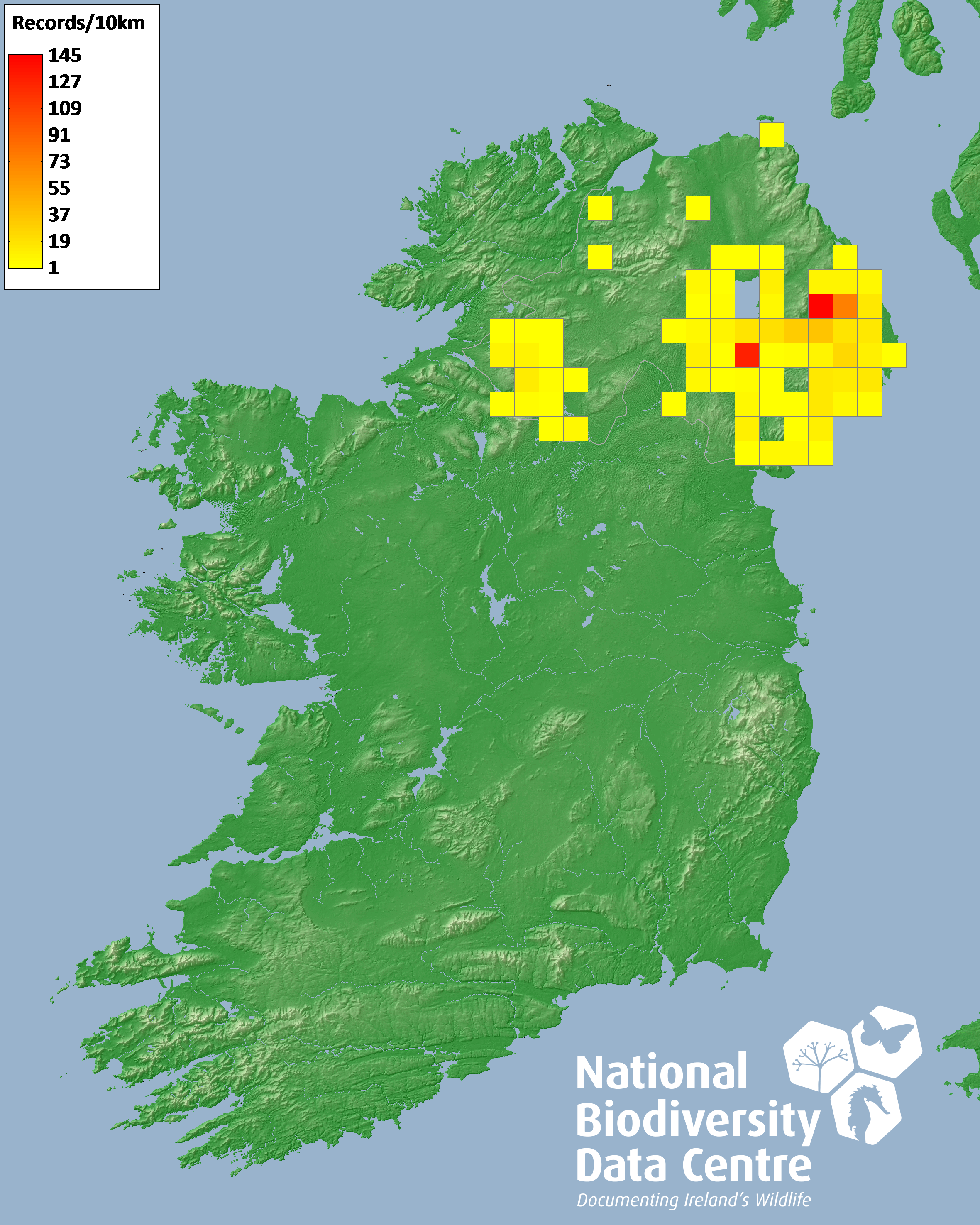 Distribution of the number of records recorded within each 10km grid square (ITM).Marine Map - 50km