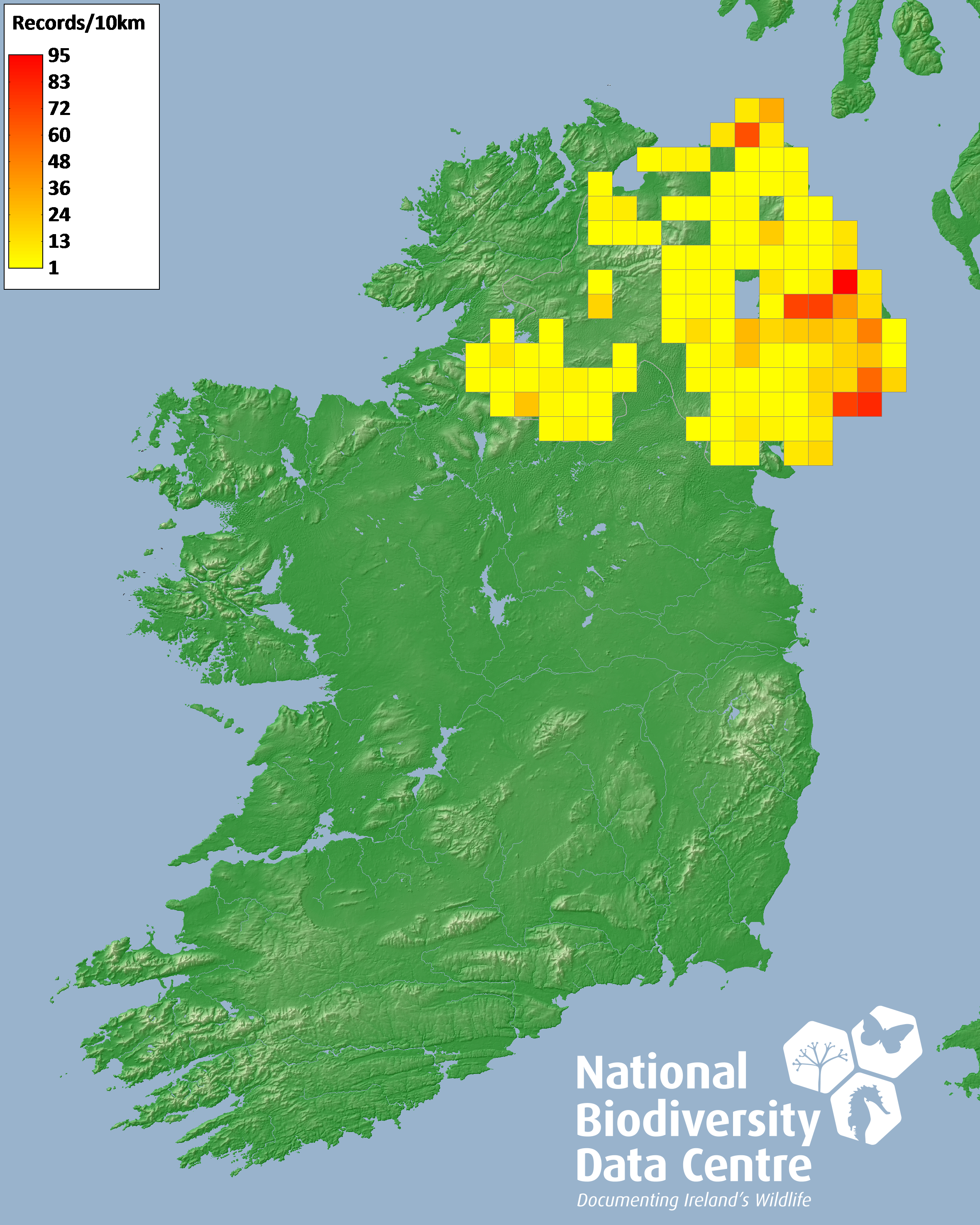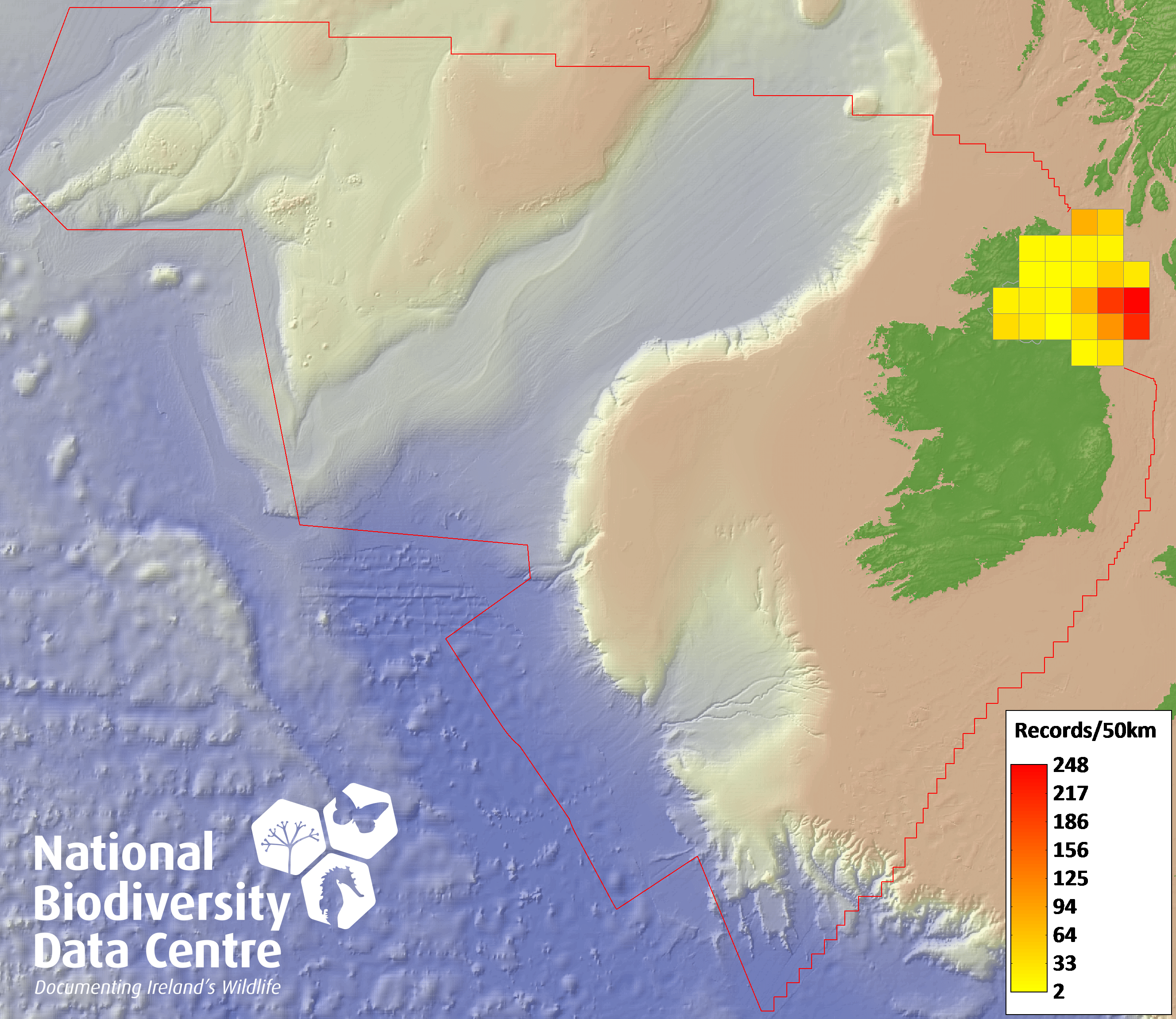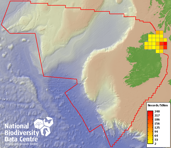 Distribution of the number of records recorded within each 10km grid square (ITM).Marine Map - 50km