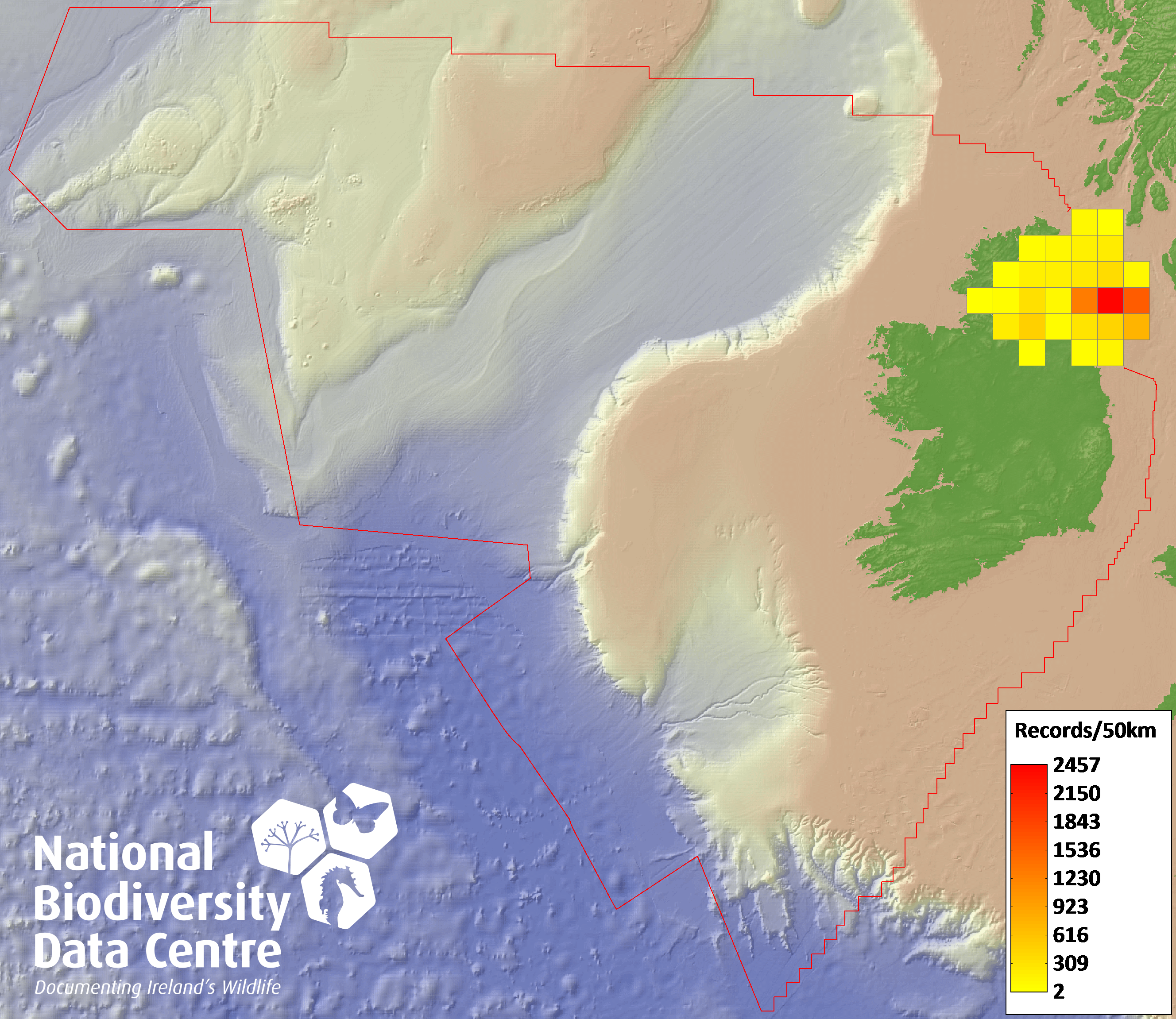 Distribution of the number of records recorded within each 10km grid square (ITM).Marine Map - 50km