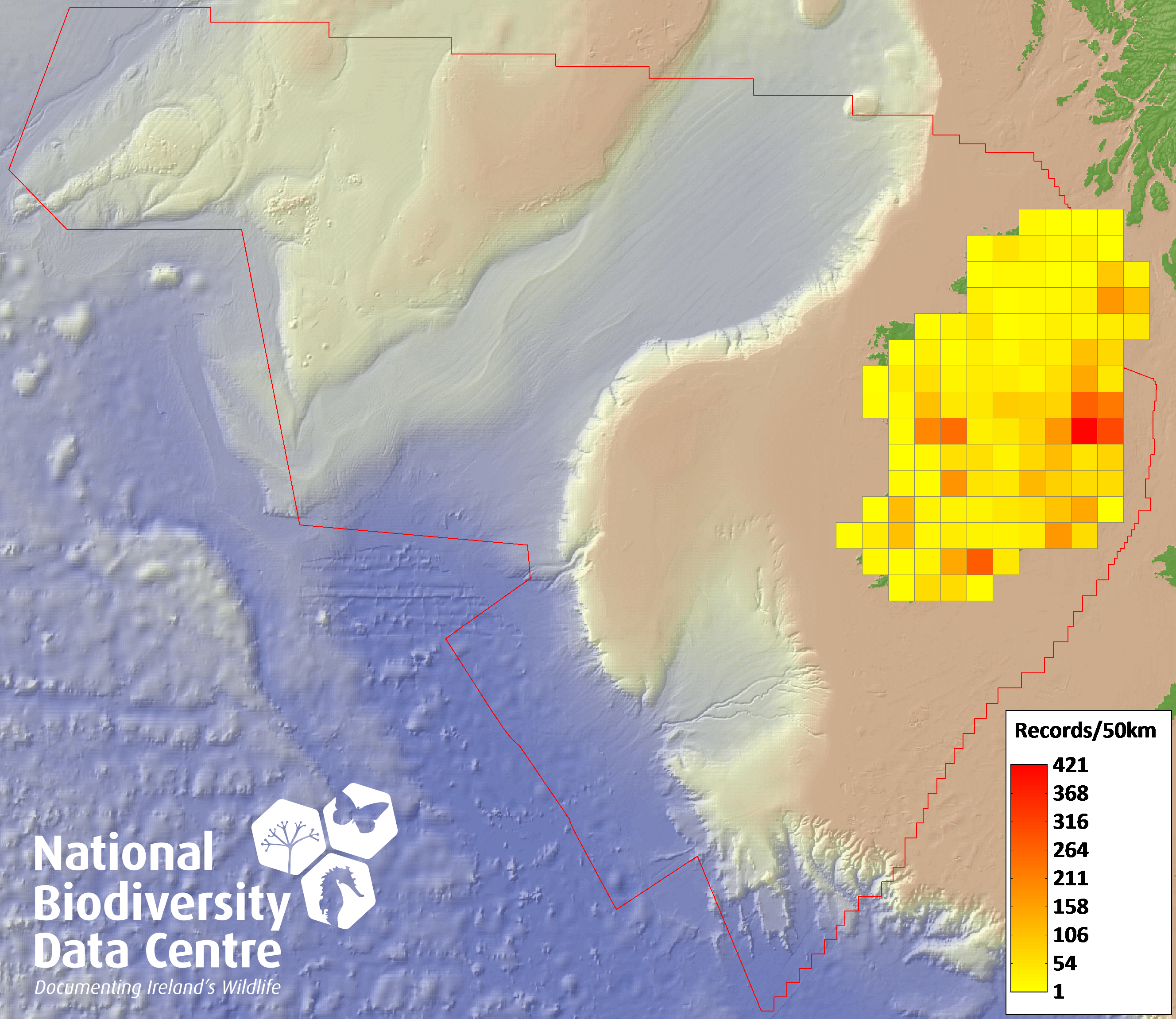 Distribution of the number of records recorded within each 10km grid square (ITM).Marine Map - 50km
