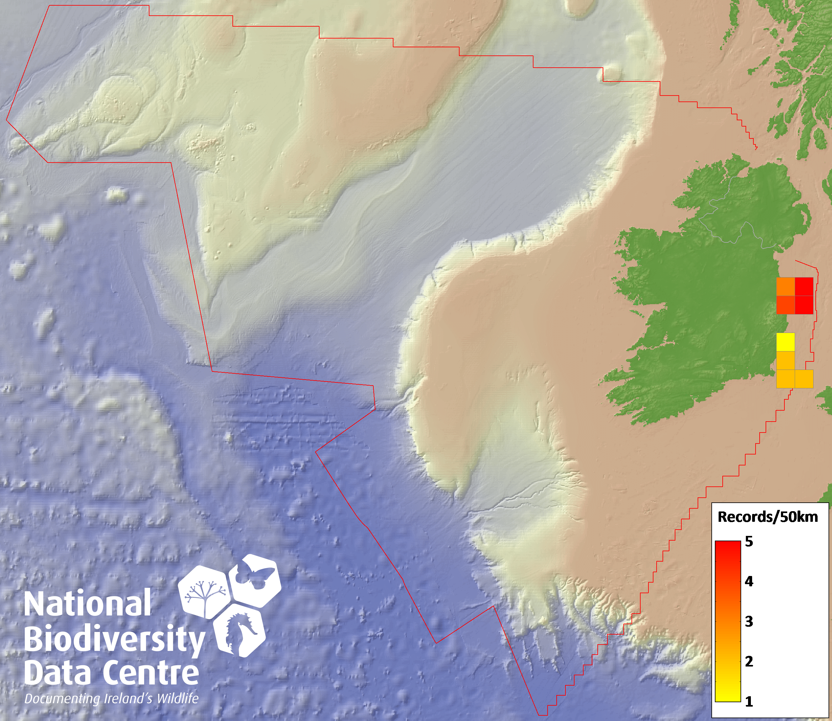 Distribution of the number of records recorded within each 10km grid square (ITM).Marine Map - 50km