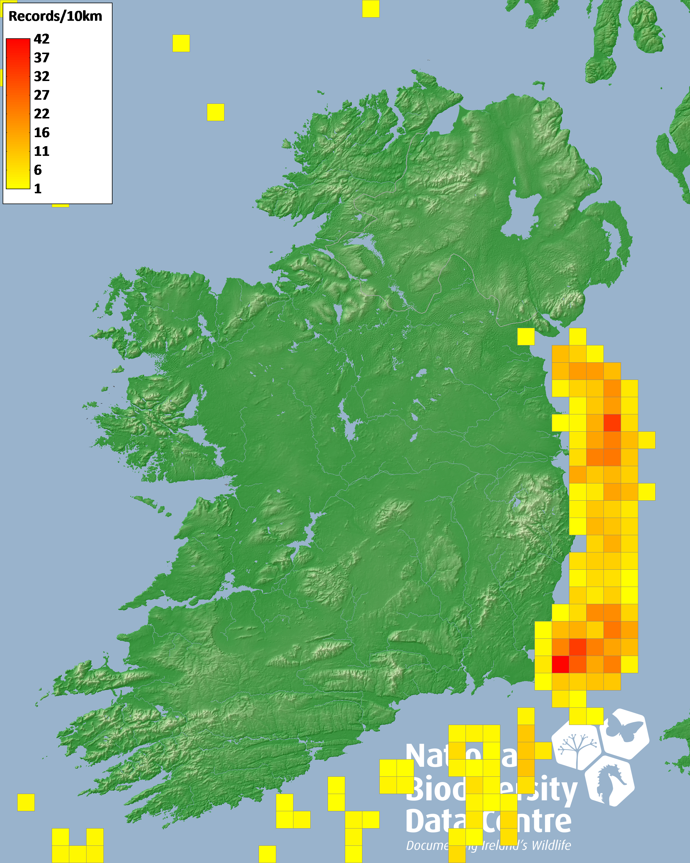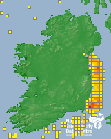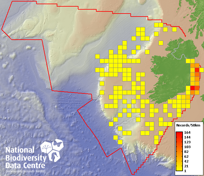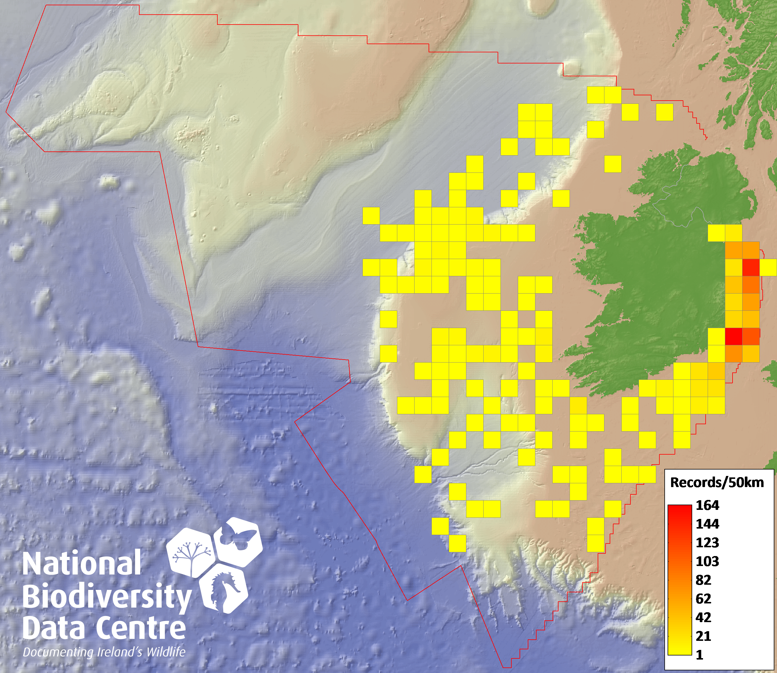 Distribution of the number of records recorded within each 10km grid square (ITM).Marine Map - 50km