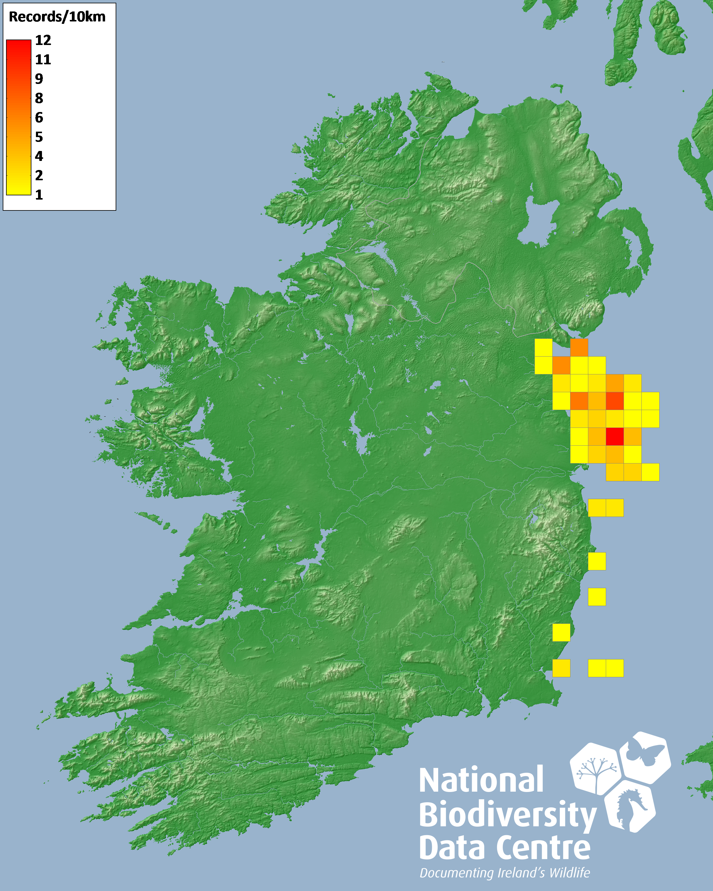 Distribution of the number of records recorded within each 10km grid square (ITM).Marine Map - 50km