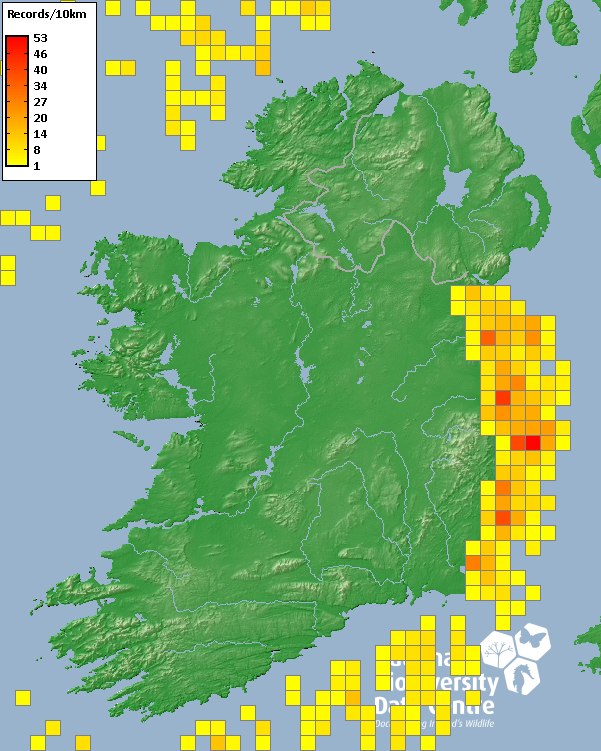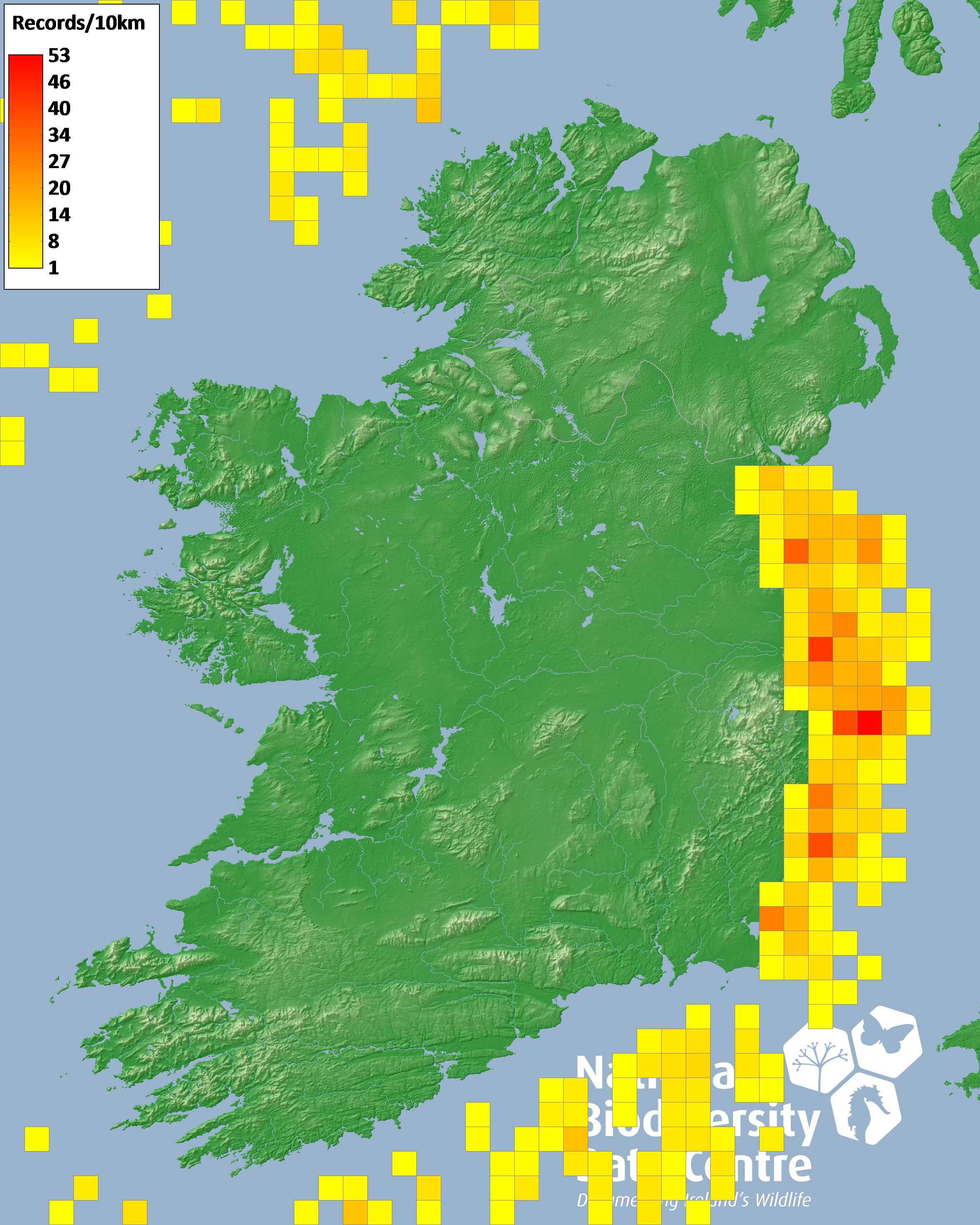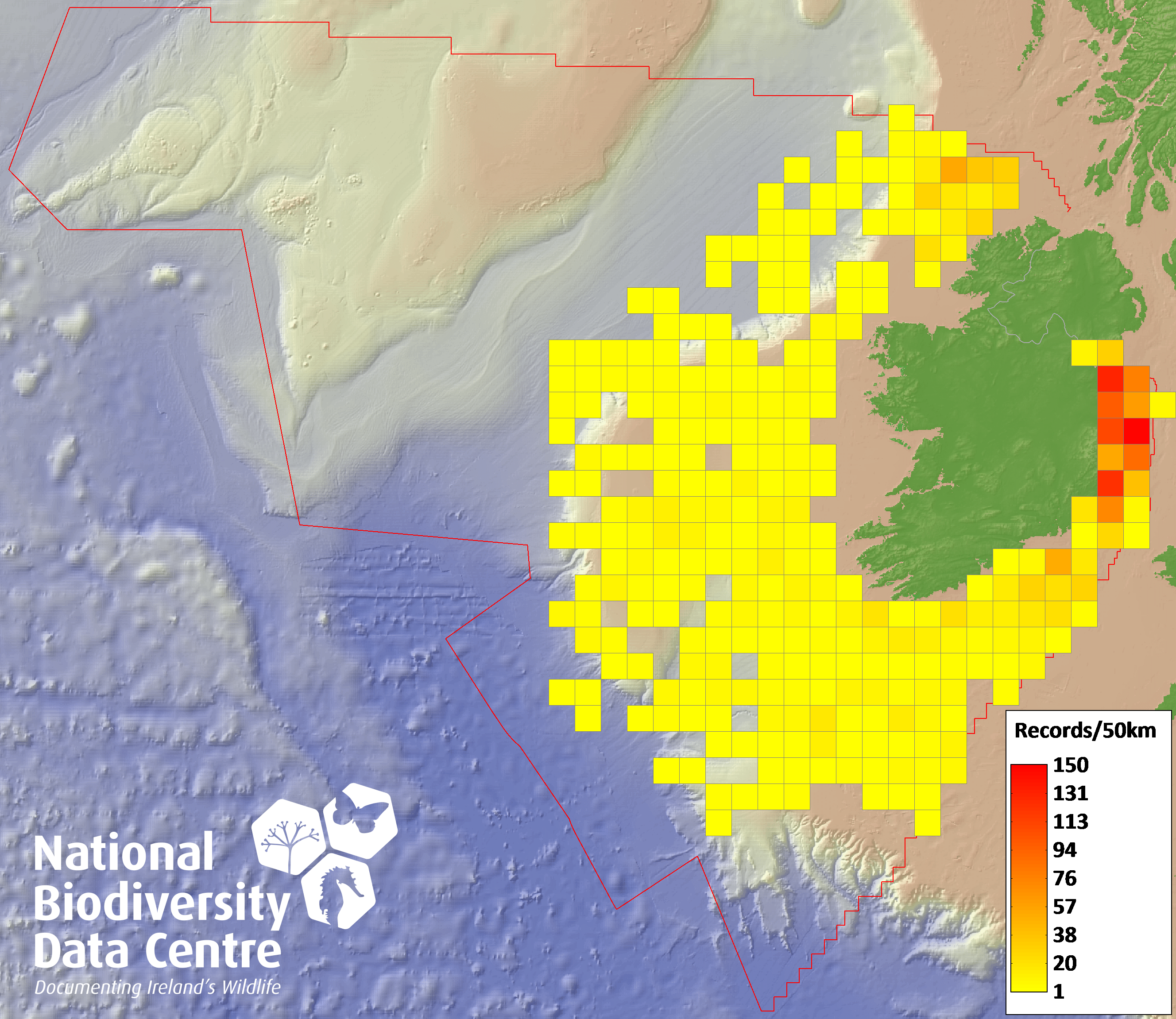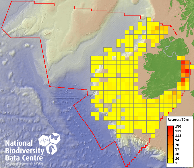 Distribution of the number of records recorded within each 10km grid square (ITM).Marine Map - 50km