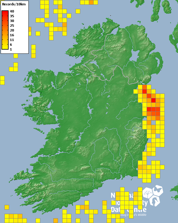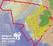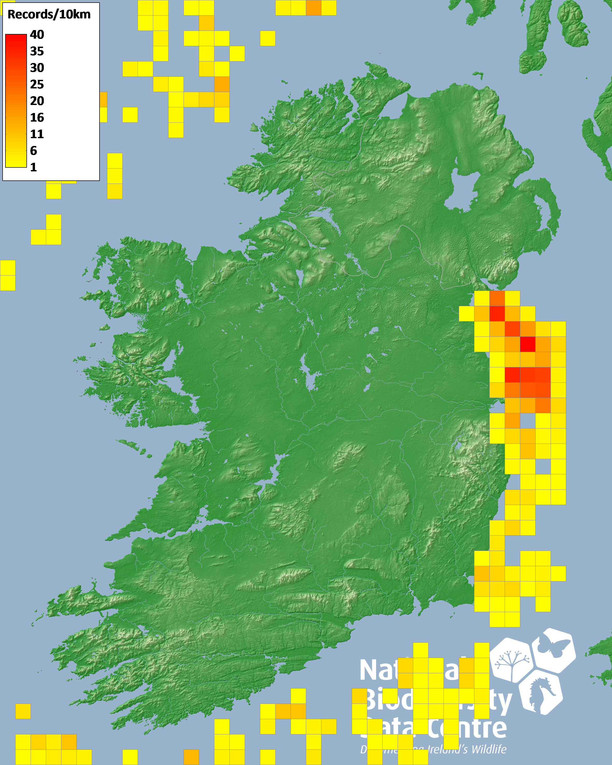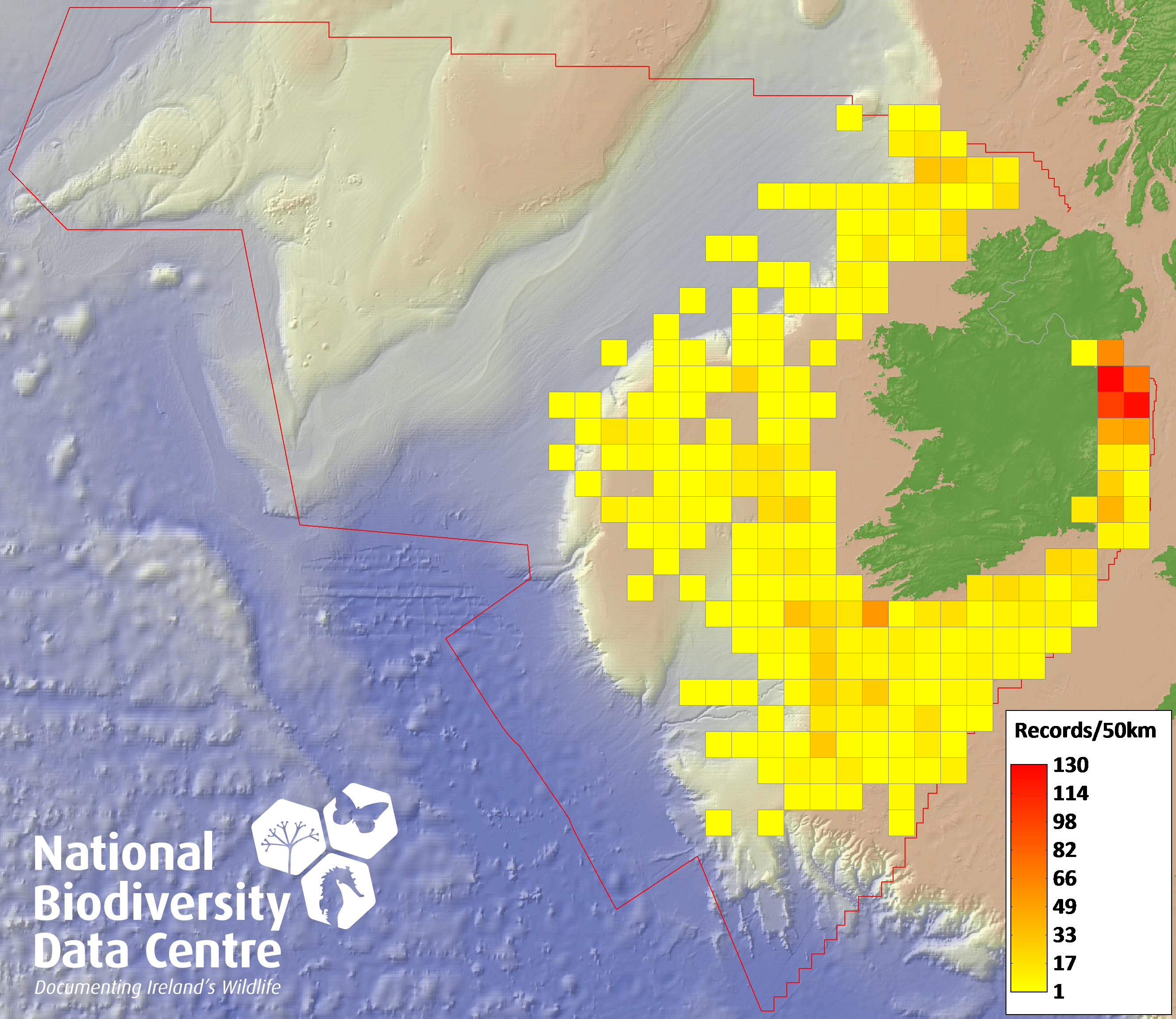 Distribution of the number of records recorded within each 10km grid square (ITM).Marine Map - 50km