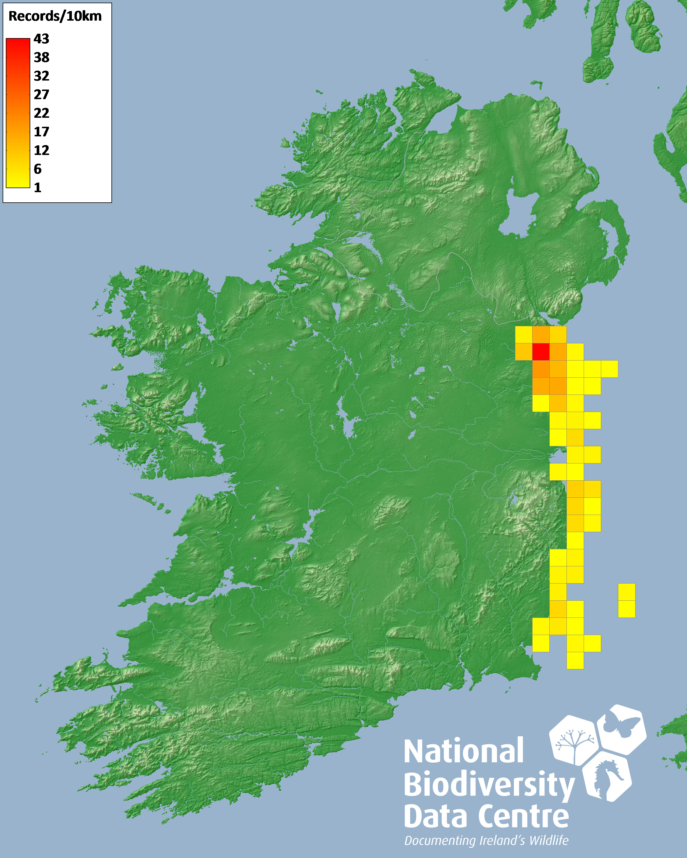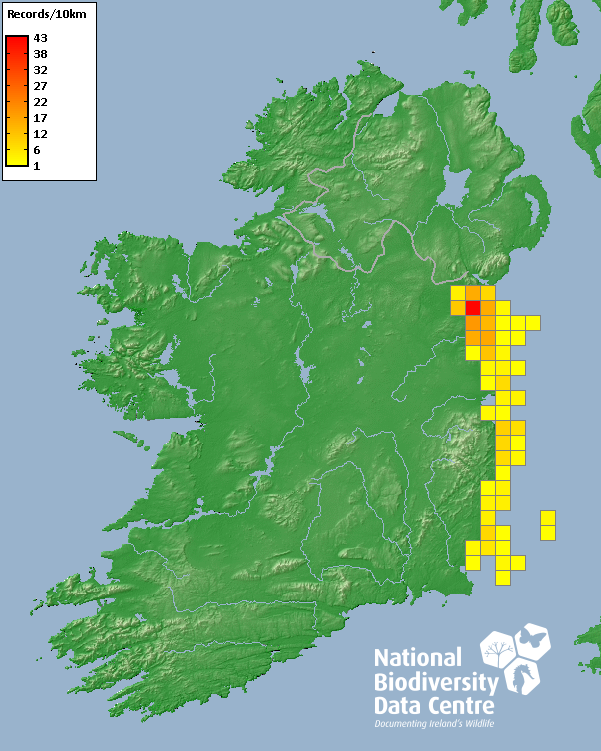 Distribution of the number of records recorded within each 10km grid square (ITM).Marine Map - 50km