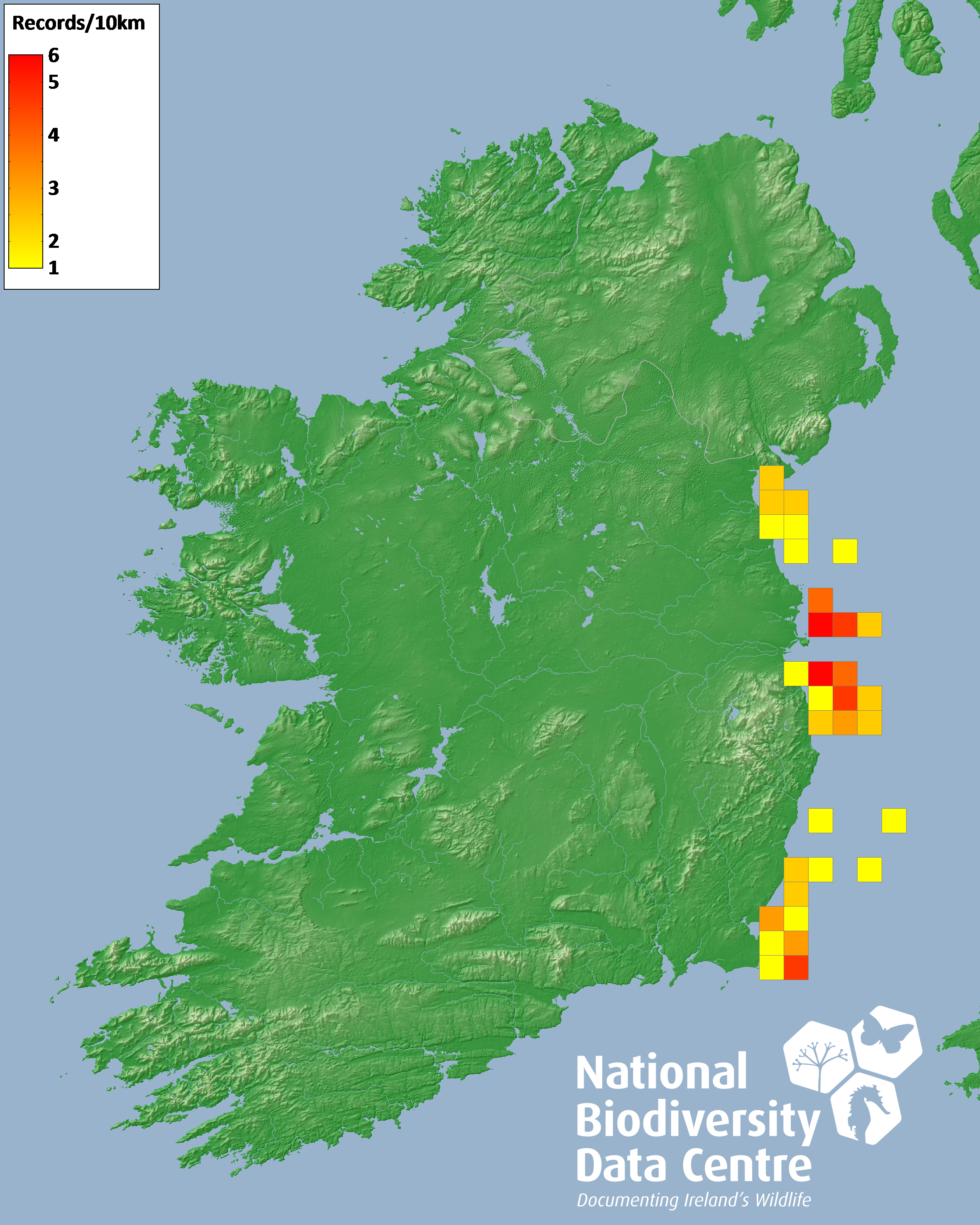 Distribution of the number of records recorded within each 10km grid square (ITM).Marine Map - 50km