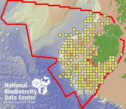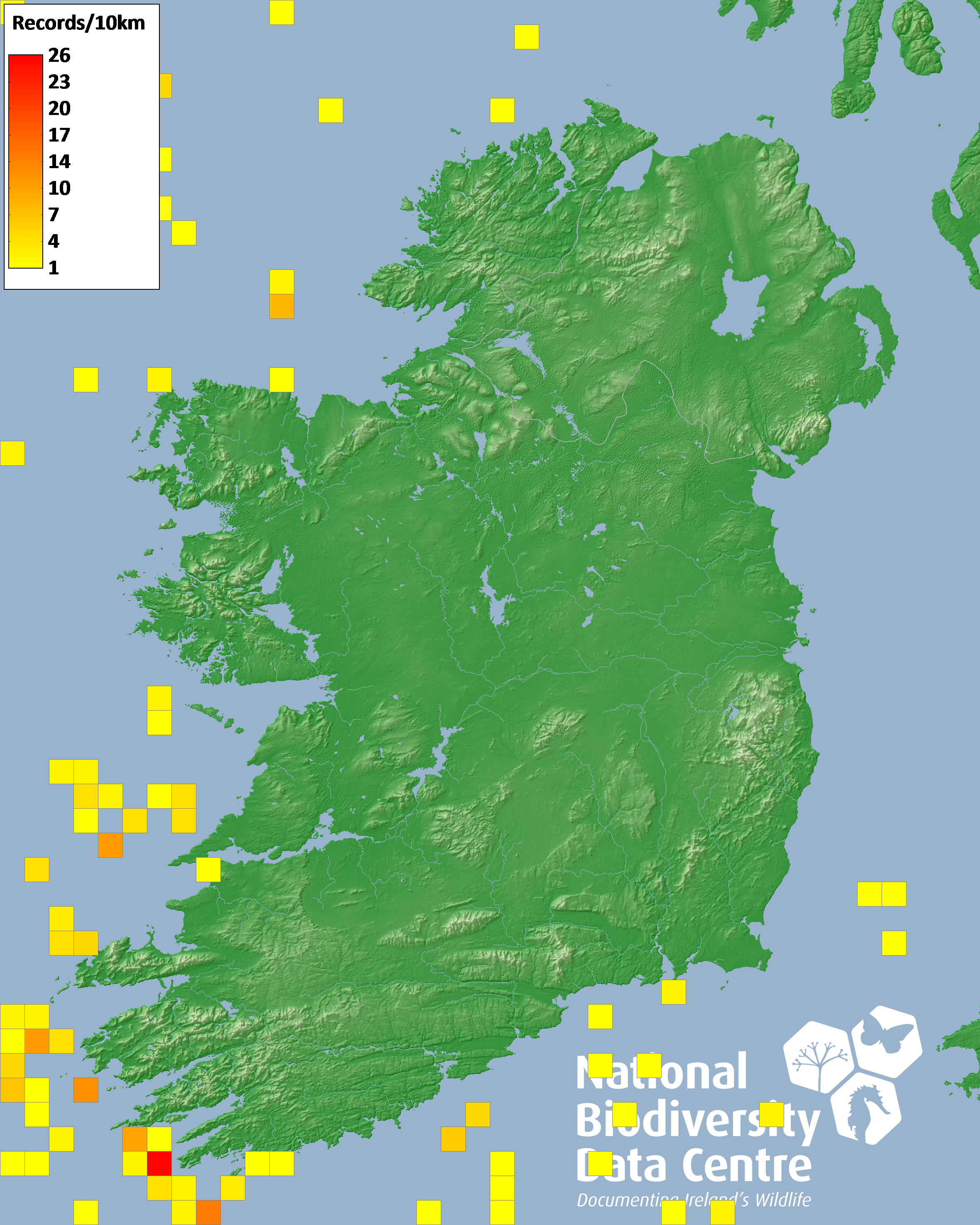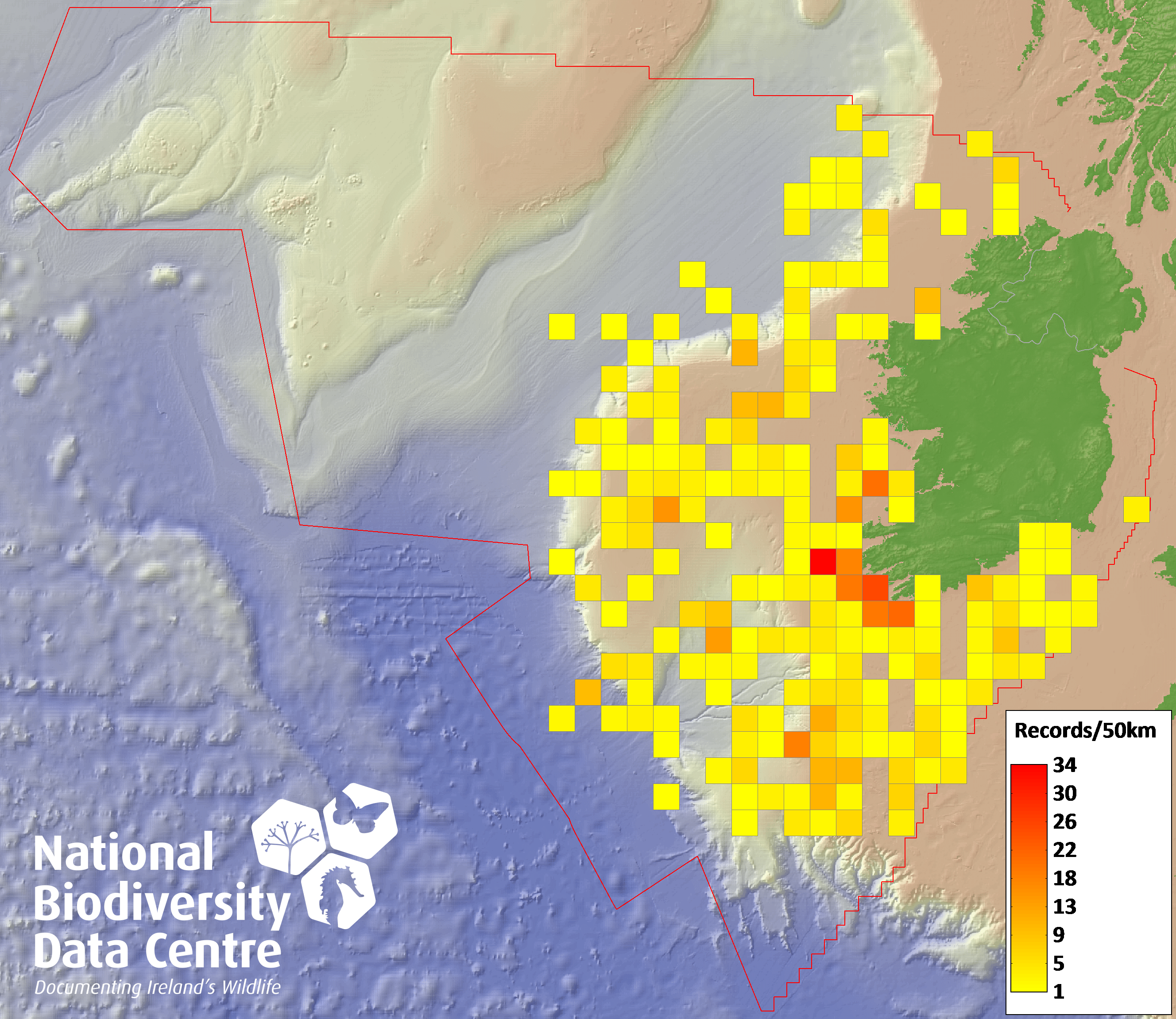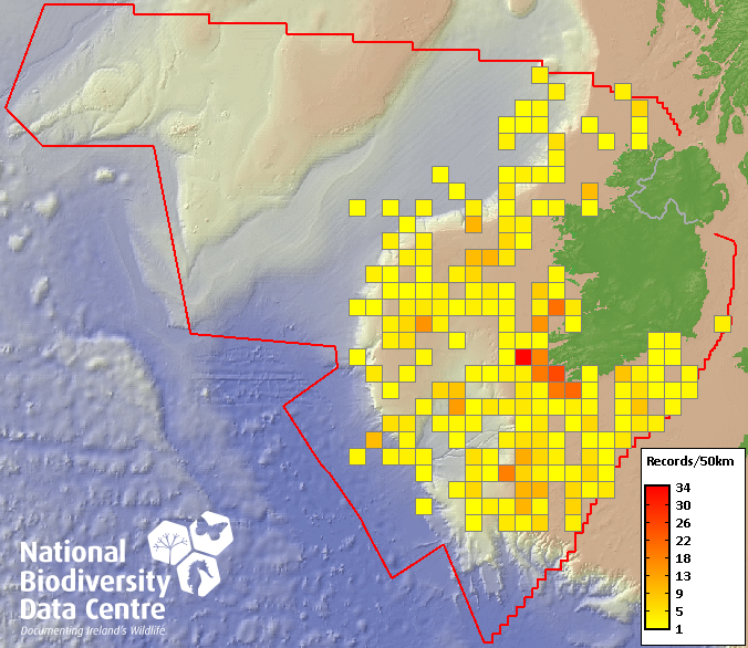 Distribution of the number of records recorded within each 10km grid square (ITM).Marine Map - 50km
