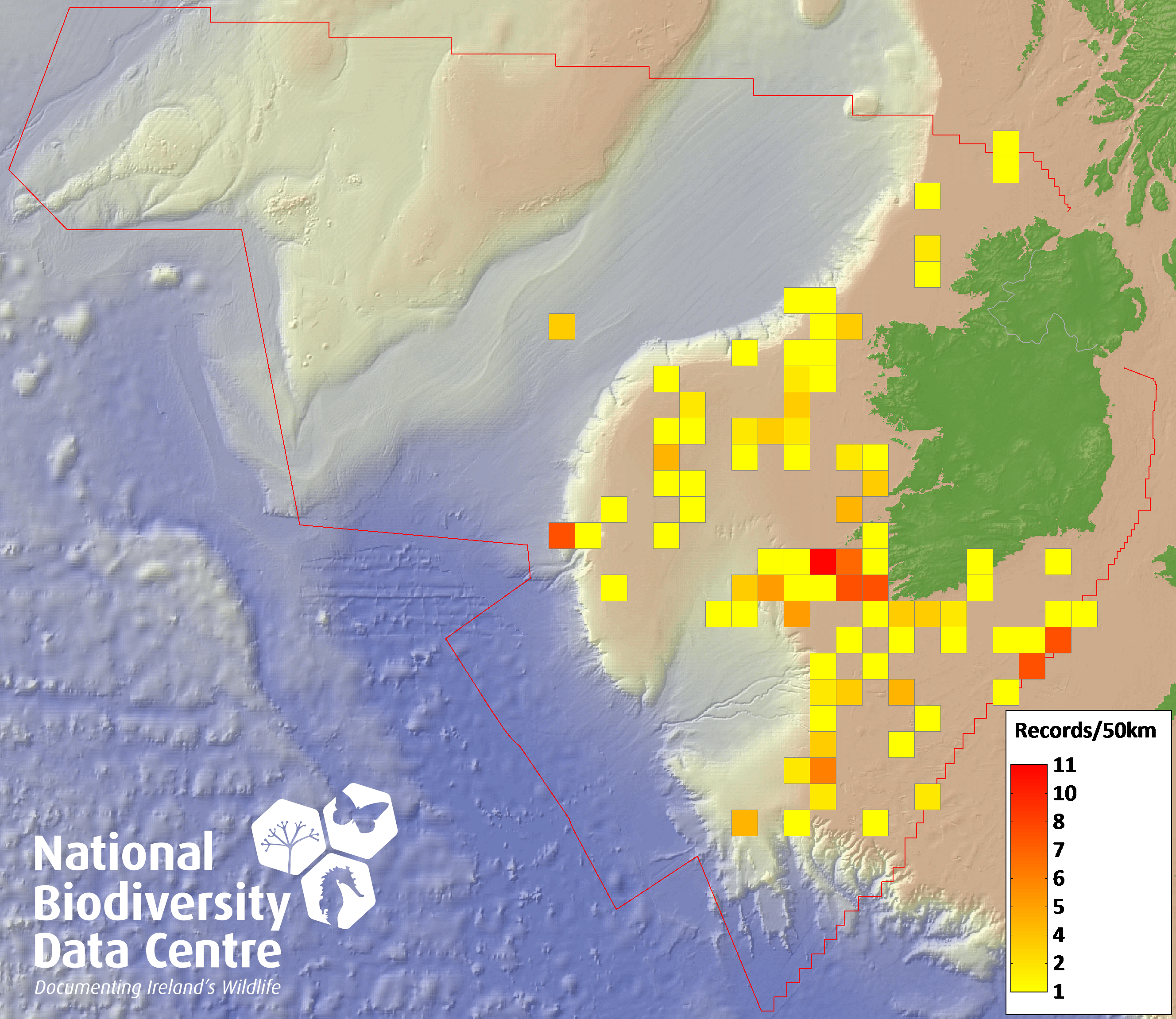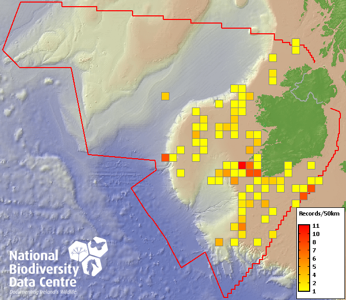 Distribution of the number of records recorded within each 10km grid square (ITM).Marine Map - 50km