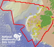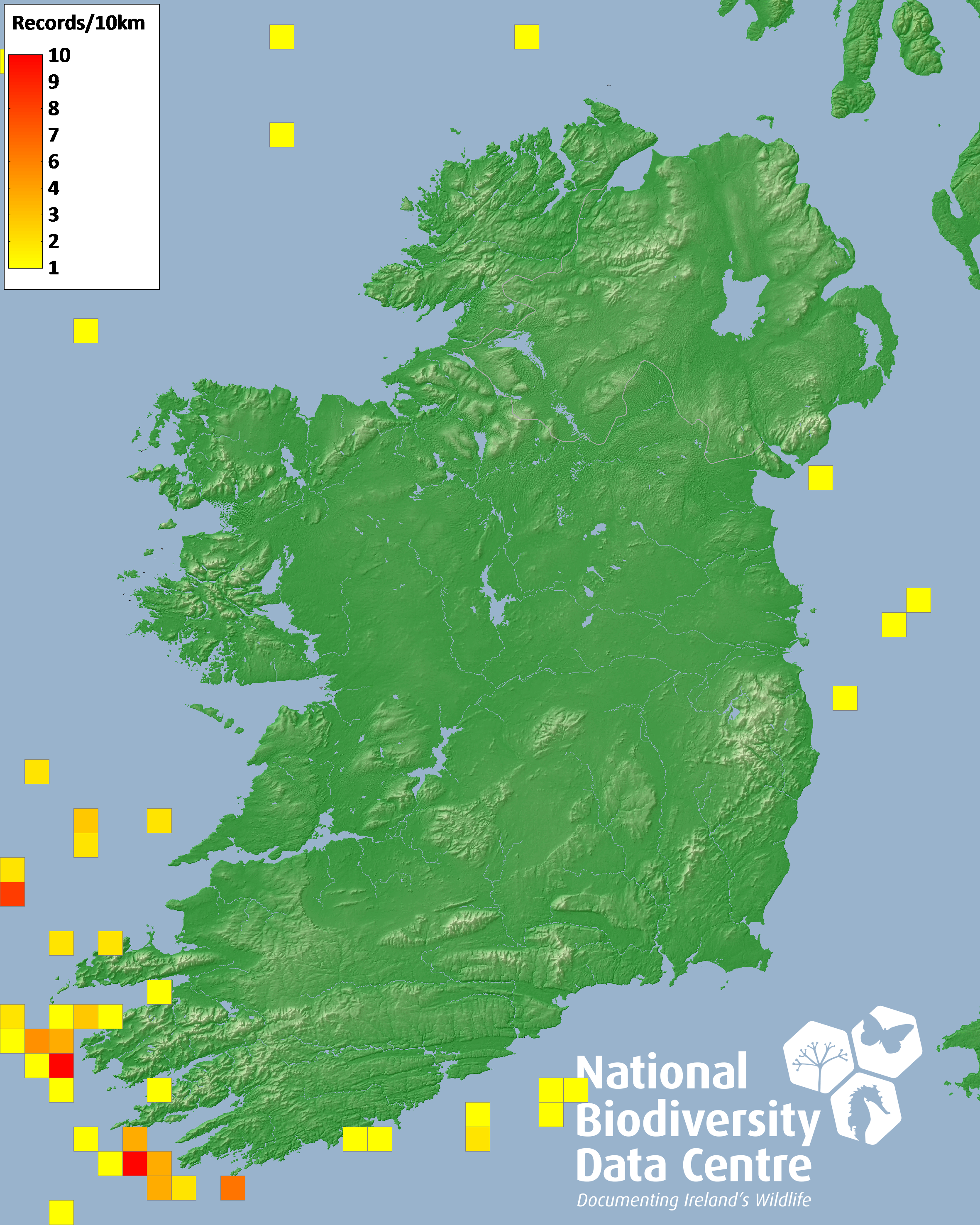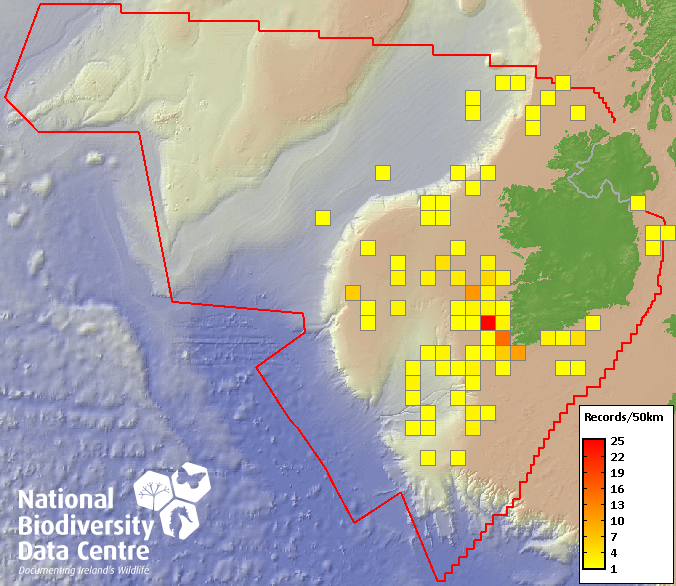 Distribution of the number of records recorded within each 10km grid square (ITM).Marine Map - 50km